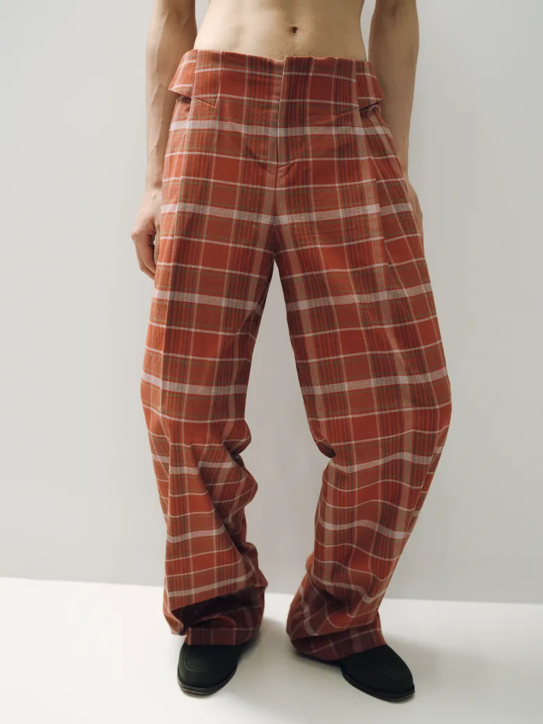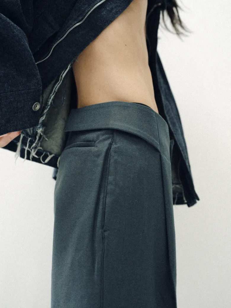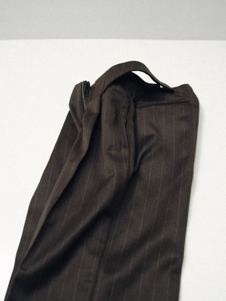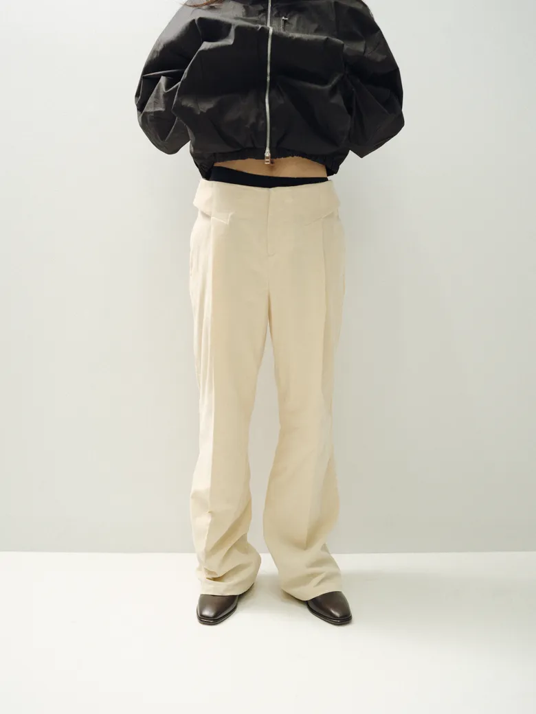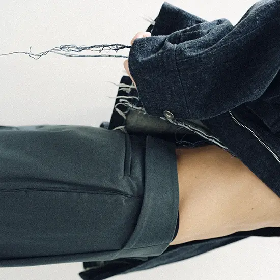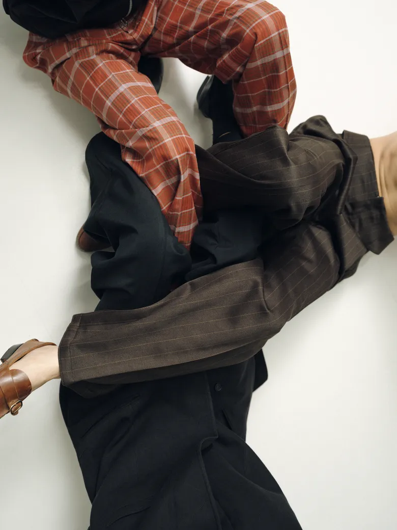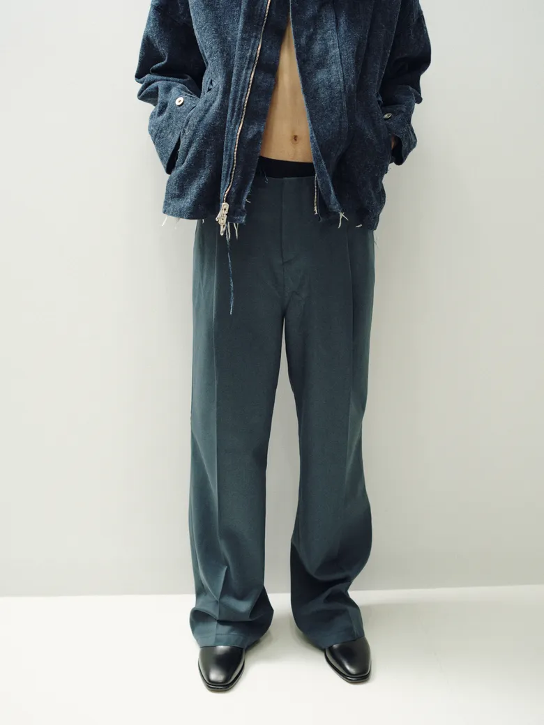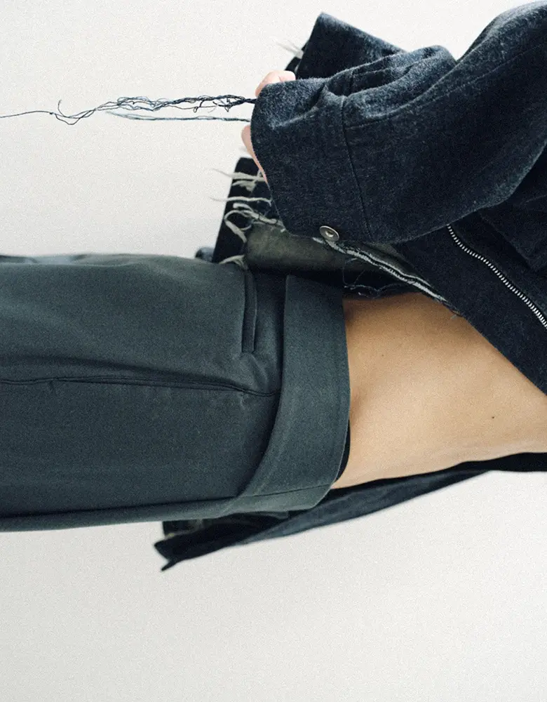 今回の別注パンツには、<BIBLIOTHERK>のアーカイブに保管されていた希少なデッドストックファブリックや、再生産が困難な特別な素材を採用。5種類の異なる生地が使用されており、それぞれの質感や光沢、落ち感が、定番のシルエットに新しい表情をもたらしている。ブランドが掲げる構築的な美意識がより際立つ仕上がりだ。