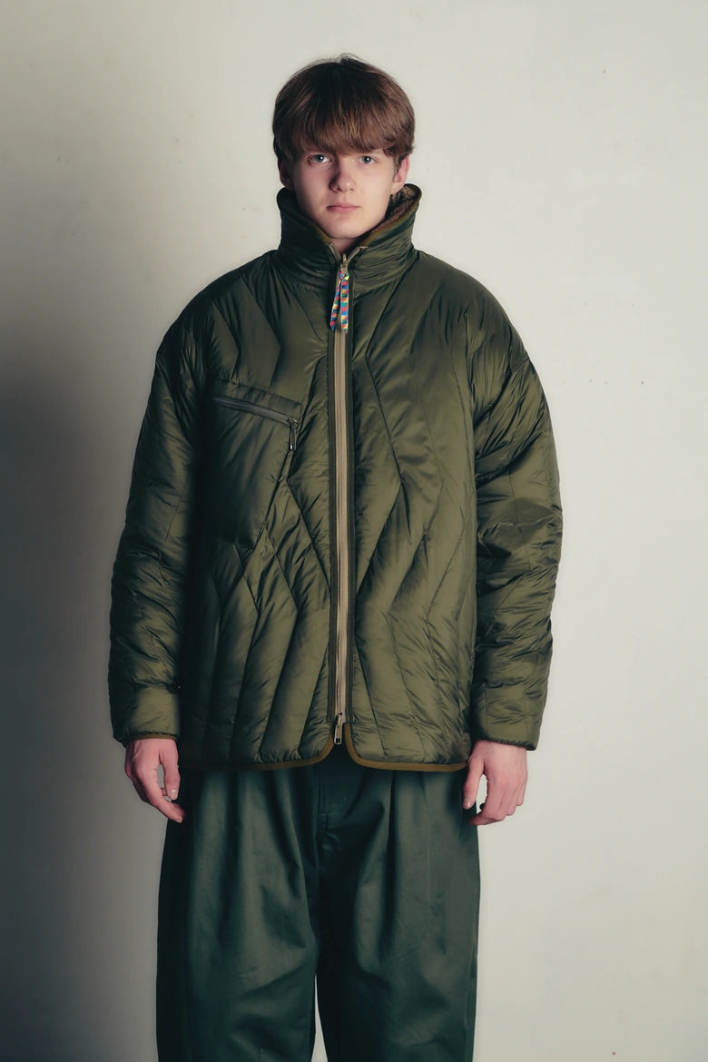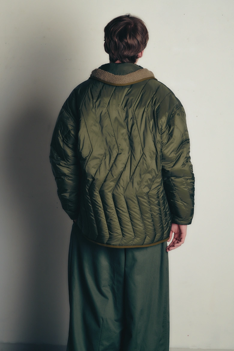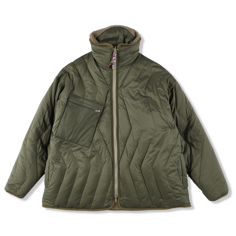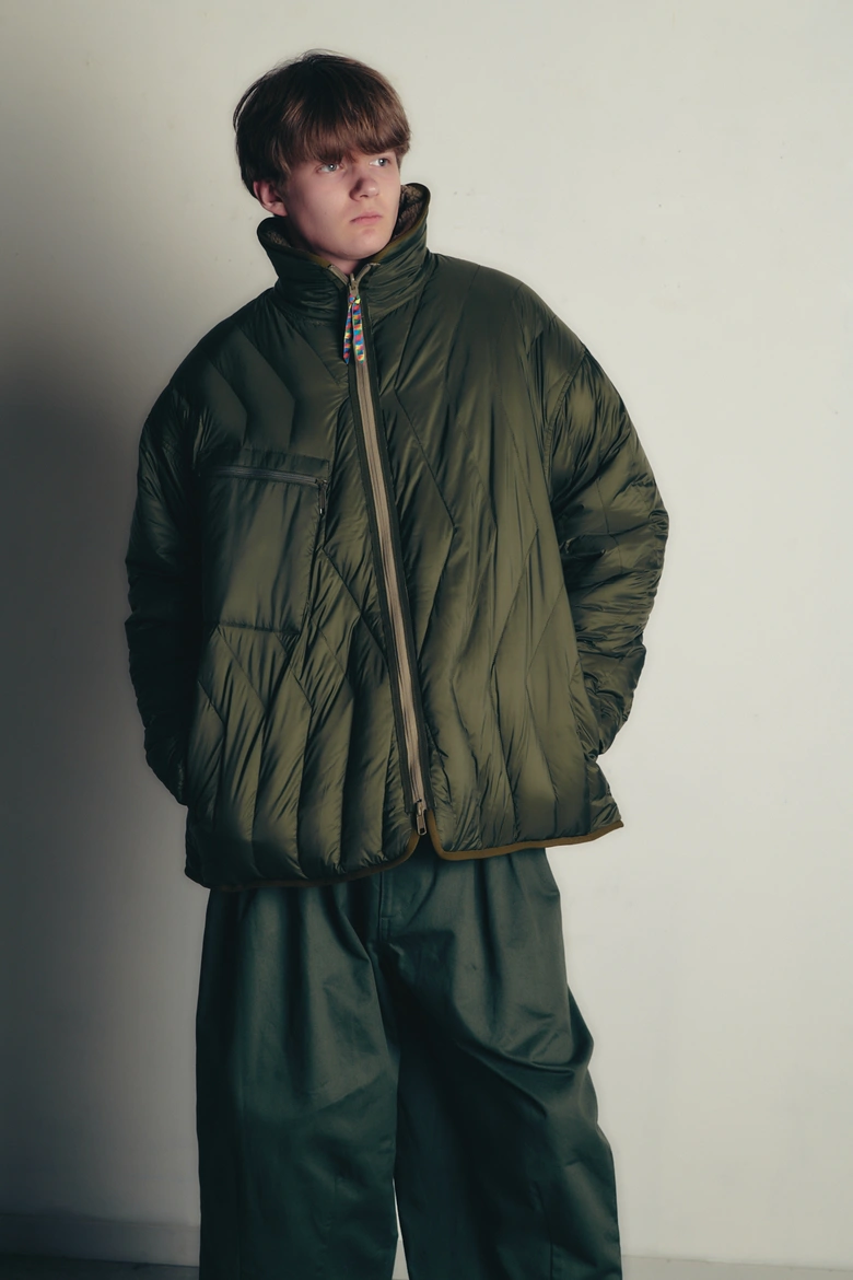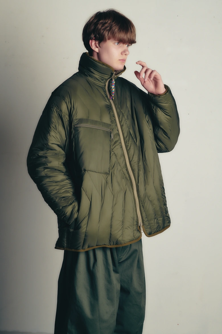 TAIONとのコラボレーションによって誕生した、高機能リバーシブルダウンジャケット。フリース面は、アメリカ軍のECWCS(拡張式寒冷地被服システム)をモチーフにデザイン。ダウンキルティング面は、ドイツ軍の要素を取り入れた仕様。中綿には、800フィルパワー以上の高品質ダウンを採用。羽毛特有の優れた温度・湿度調整機能に加え、非常に軽く、肌触りの良い素材感が特徴である。風の強い日でもしっかりと温かさを保ち、都市生活にもアウトドアにも対応する万能な防寒アイテムとなっている。
