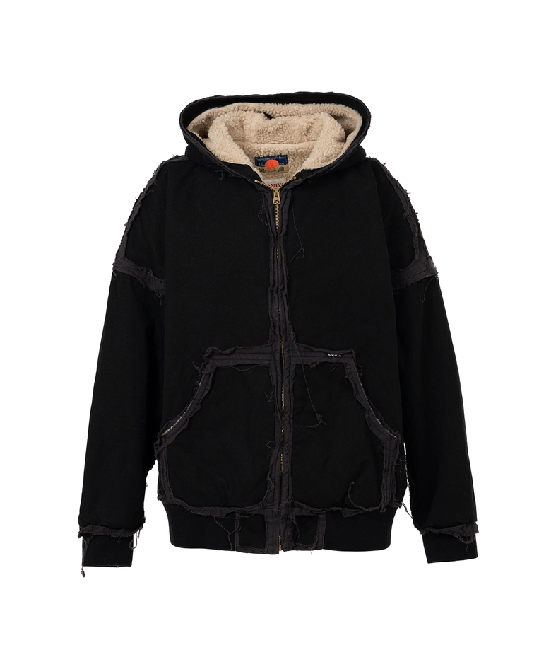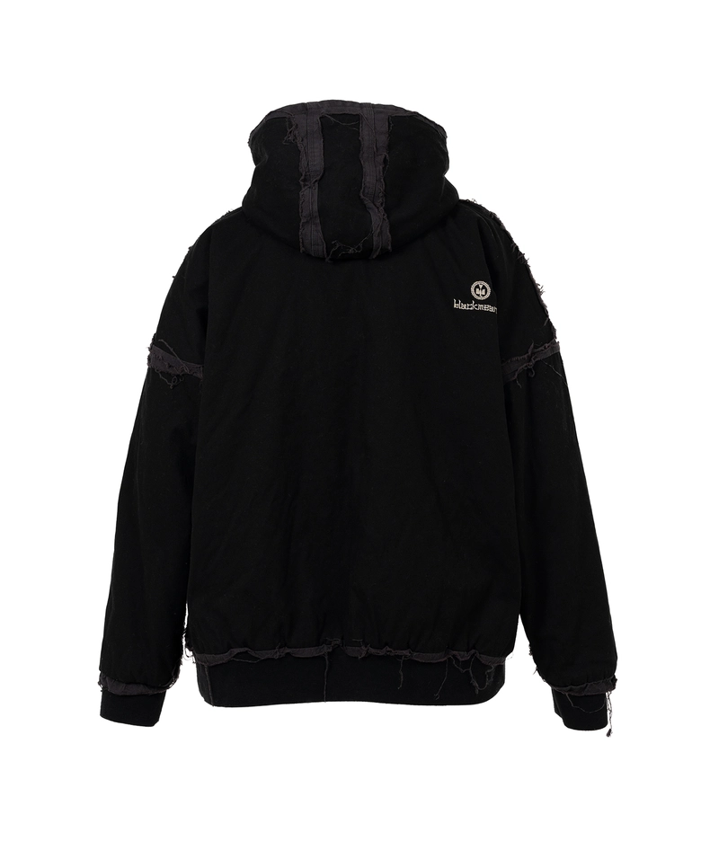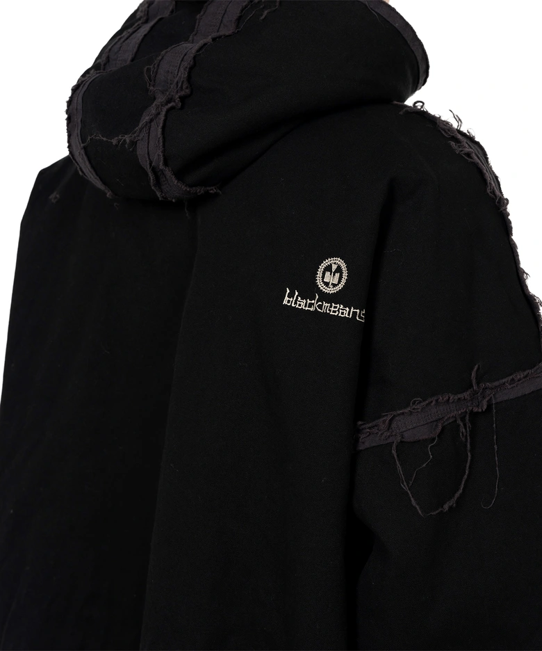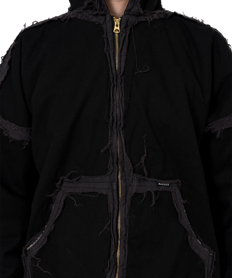 本コラボレーションはデザイナー神谷が私物で所有している<blackmeans> の“Cut-out Denim Shoe Cut Pants”に感銘を受け、<KAMIYA>の定番であるジップパーカー、ペインターパンツに落とし込み、クロスオーバーさせたデザインとなっている。キャンバス生地とライトウェイトのコットン生地を2重にして縫製した後に、職人の手仕事でカットオフを施されている。