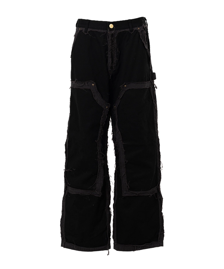 ペインターパンツはルーズフィットで、バックポケットに<KAMIYA>のピスネームと<blackmeans>のロゴを