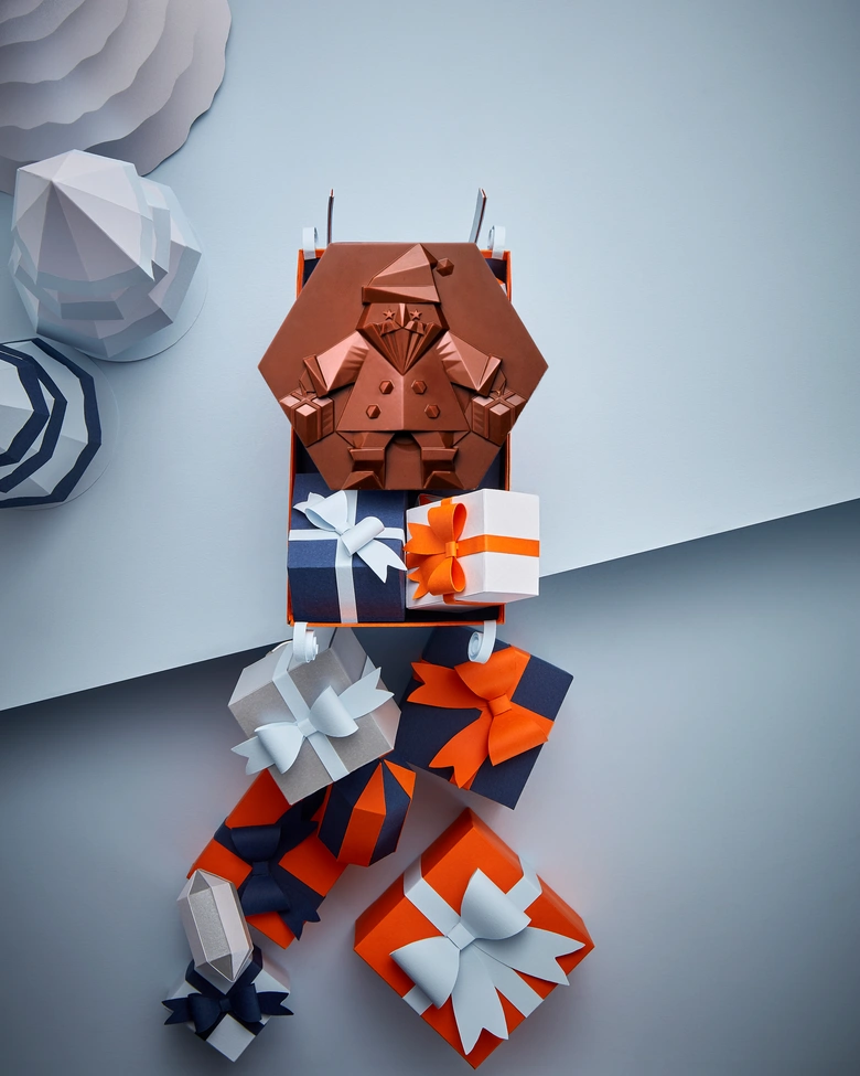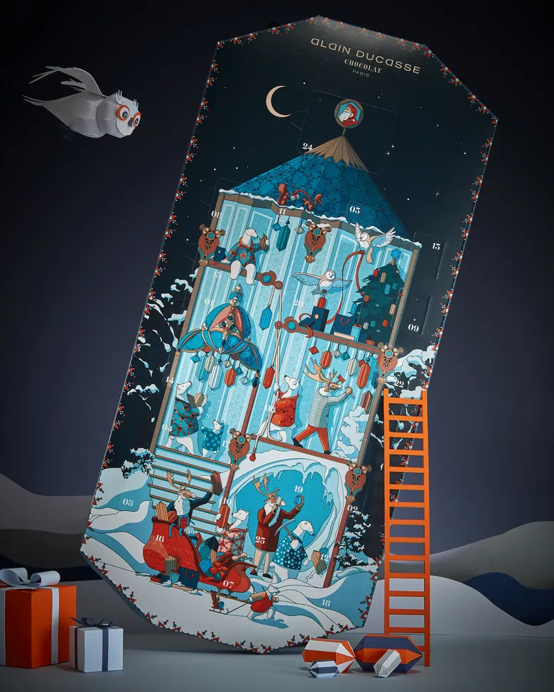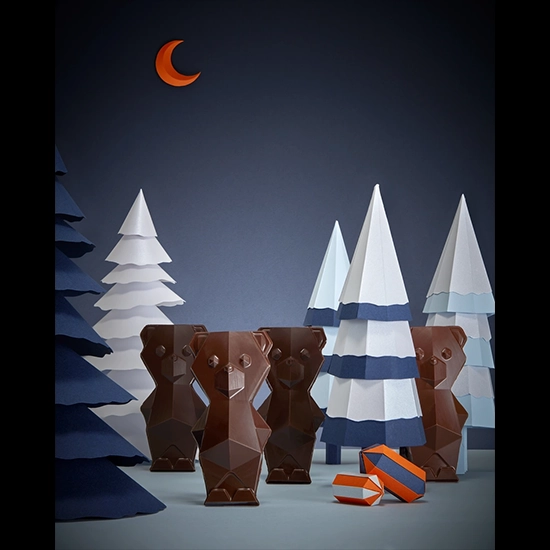ホリデーの幕開けを告げるのは、毎年人気のアドベントカレンダー「カランドリエ・ド・ラヴァン」(¥11,880)。24個の窓を開けるたびに、アーモンドプラリネ入りタブレットやクマ型ショコラなど、日替わりで異なる味わいに出会える。最後の窓を開けると、ヘーゼルナッツプラリネ入りの大きなクマのショコラがサプライズとして登場。