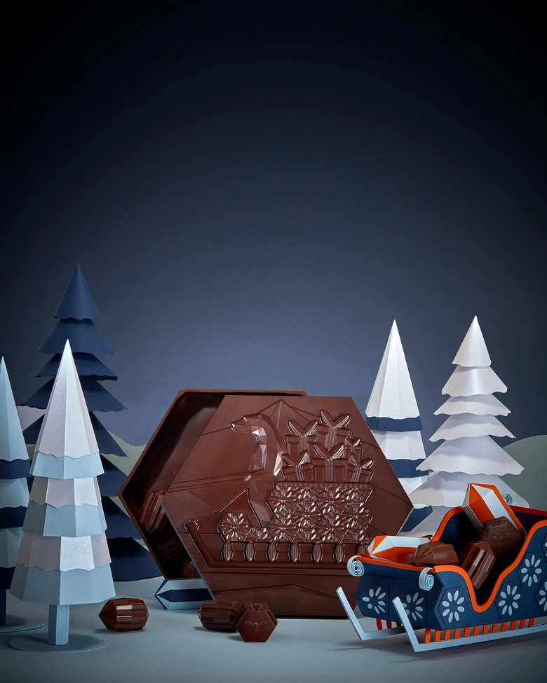 今年のコレクションは、カカオの実=ポッドを主役に、サンタクロースやトナカイ、白クマたちが冬の夜空の下でクリスマスの準備をする情景を描いた限定デザイン。ブルーを基調にしたパッケージには、温もりと遊び心が詰まっている。