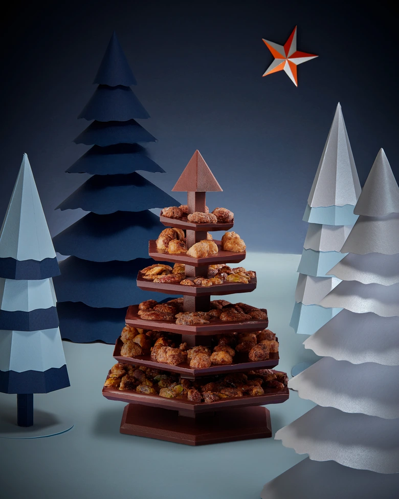また、六角形のショコラディスクを積み上げて作る「サパン・ア・モンテ」(¥14,040/ブティック限定)も、<ル・ショコラ・アラン・デュカス>の象徴的な一品。ナッツやピスタチオを散りばめたマンディアンをノワールとオ・レで交互に重ね、手仕事の美しさが際立つ仕上がりだ。