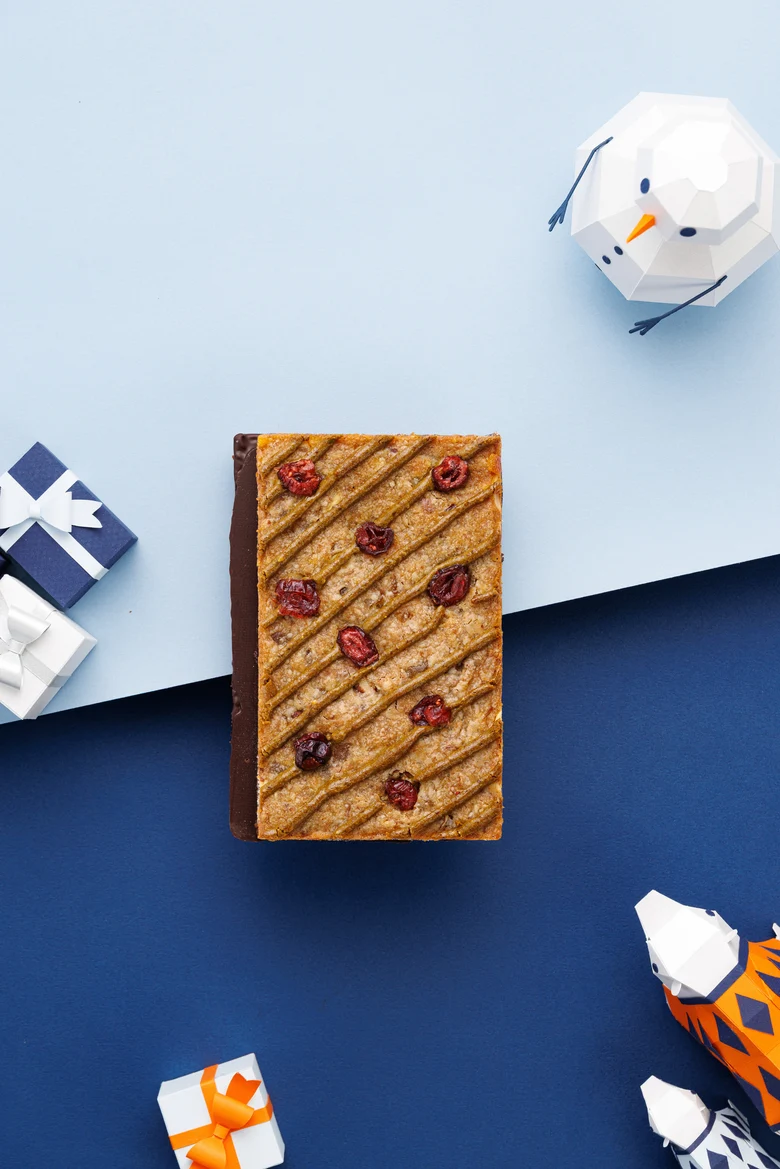 <ル・ショコラ・アラン・デュカス>のタブレットショコラから着想を得た“タブレット・ビスキュイ”。クリスマス限定で登場する「タブレット・アンシャンテ」(¥2,808)は、オレンジやグレープフルーツのコンフィ、アーモンドを混ぜ込んだビスキュイを、カカオ75%ショコラで片面コーティング。ピスタチオプラリネとドライクランベリーをあしらい、素材の風味と彩りをさりげなく添えた一枚。
