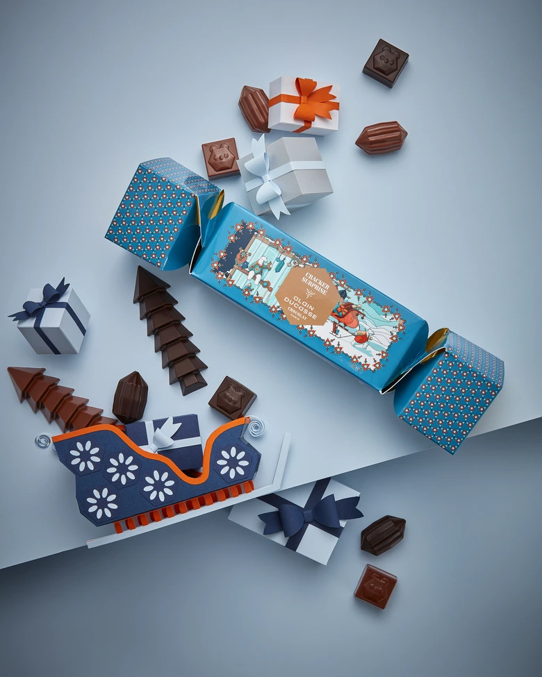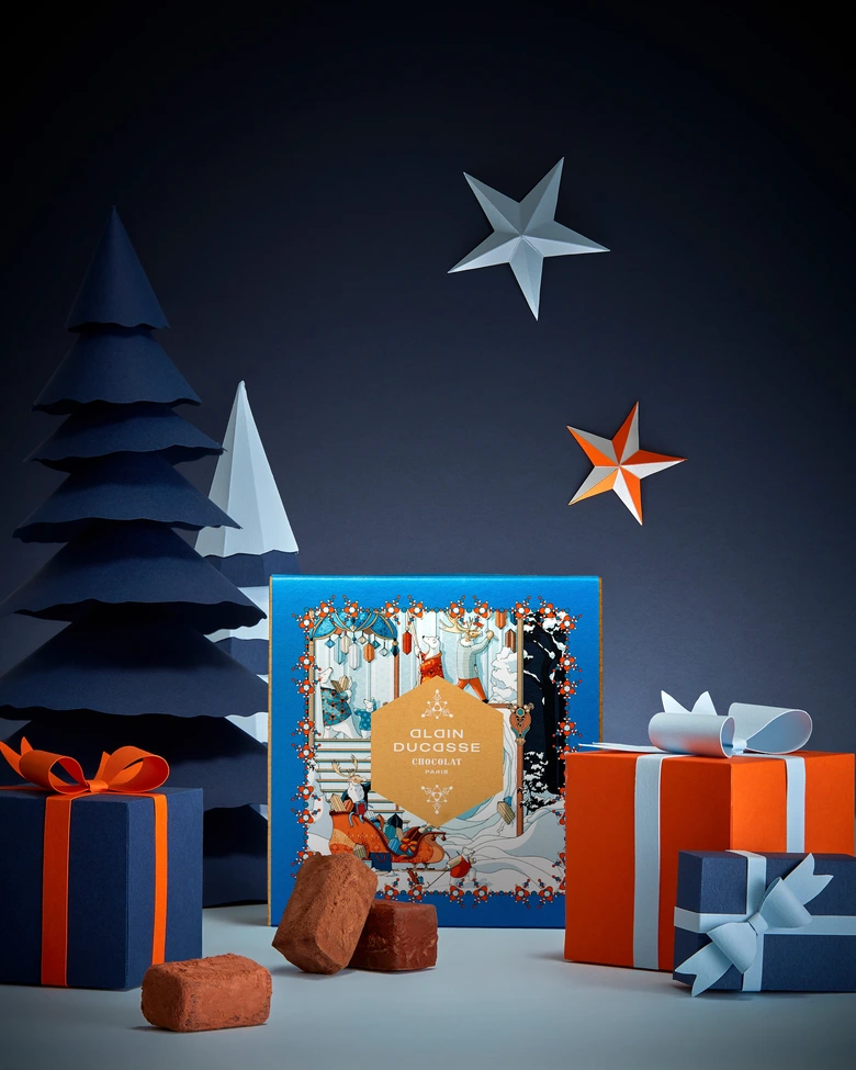 キャンディー型パッケージの中には、クマやツリーを模したショコラがぎっしり。ヘーゼルナッツやココナッツのプラリネが香ばしく、ホリデー気分を盛り上げる。