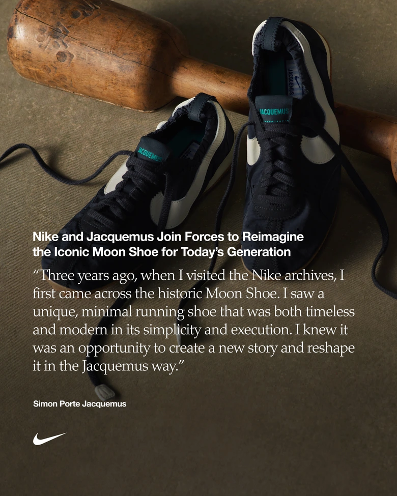 伝統を重んじつつも革新を恐れない<NIKE(ナイキ)>と、現代的な美学を追求する<JACQUEMUS(ジャックムス)>。両者の感性が交差したこのムーンシューズは、ランニングシューズの歴史に新たな1ページを刻むことになりそうだ。