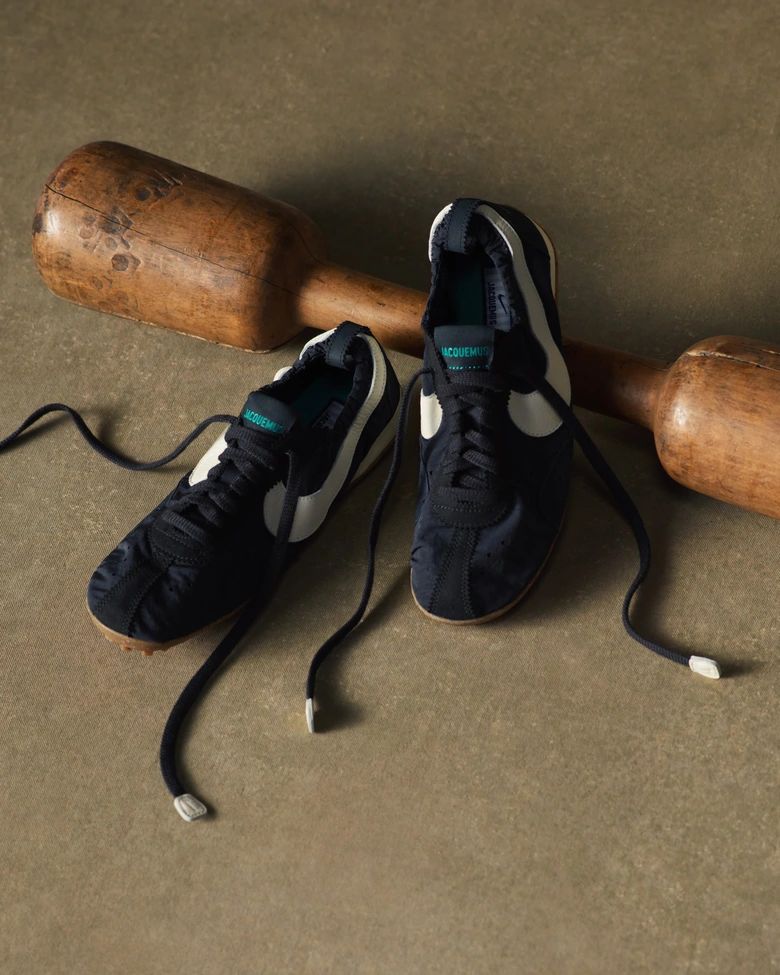 新作ムーンシューズは、しわ加工を施したナイロンアッパーに、<NIKE>が誇るRegrindアウトソールを採用。レザーのスウッシュとヒールカウンター、そしてシュータンやヒール、ソックライナーに<JACQUEMUS>のロゴをあしらい、レース用シューズとモダンバレエの美学を融合させたコンテンポラリーなローカットデザインに仕上げられている。専用のボックスには、<NIKE>のルーツであるブルーリボン スポーツ時代を彷彿とさせる両ブランドのロゴが施されている。