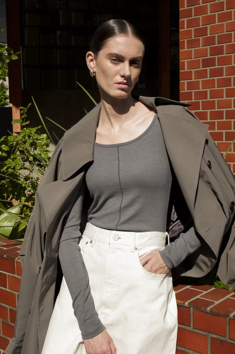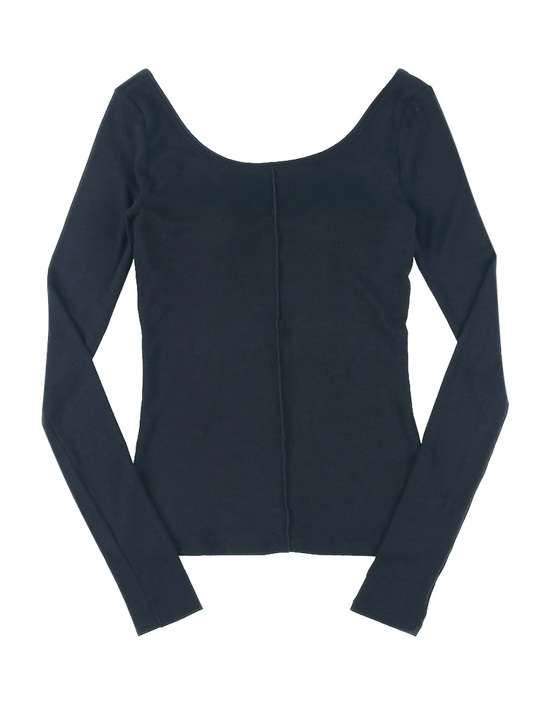 保温性のあるなめらかな素材で、秋口から真冬までロングシーズン活躍するカップ付きトップス。デザイン性と機能性を兼ね備えた1枚で、見せても重ねても美しく決まる便利なアイテムとなっている。