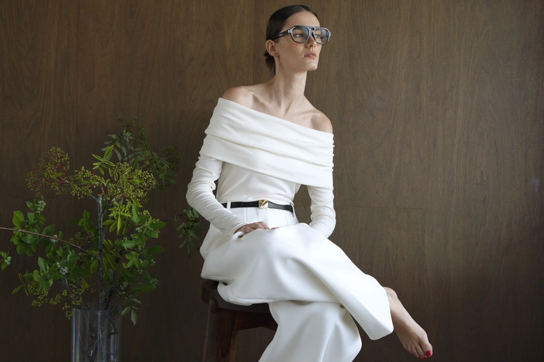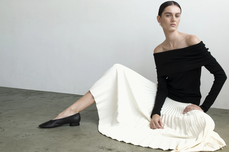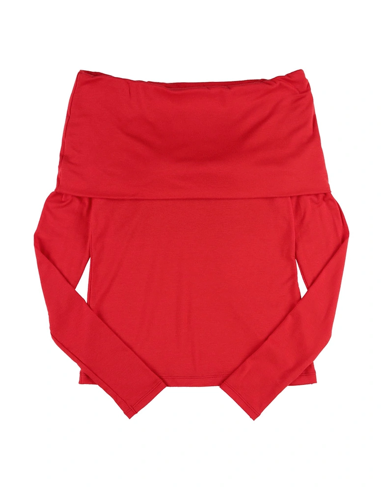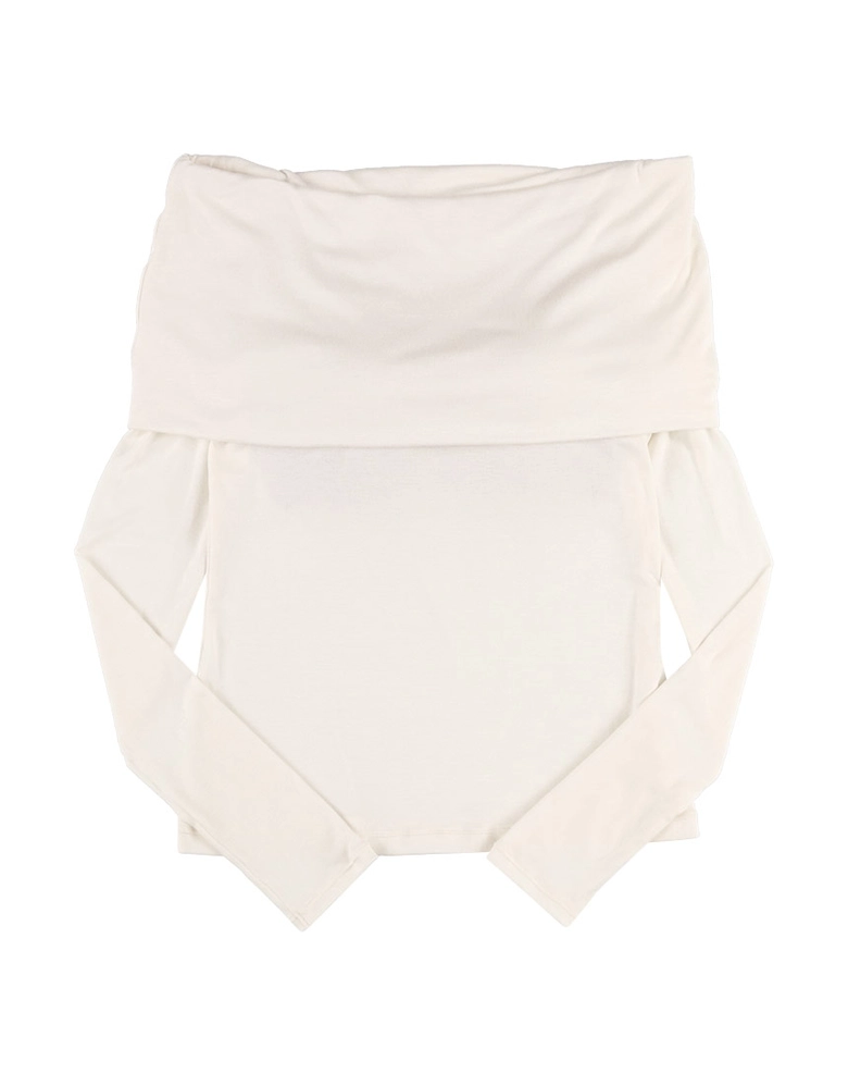 昨年のオフショルダートップスの新作として素材を変えて、タイトめなシルエットにアップデートされている。