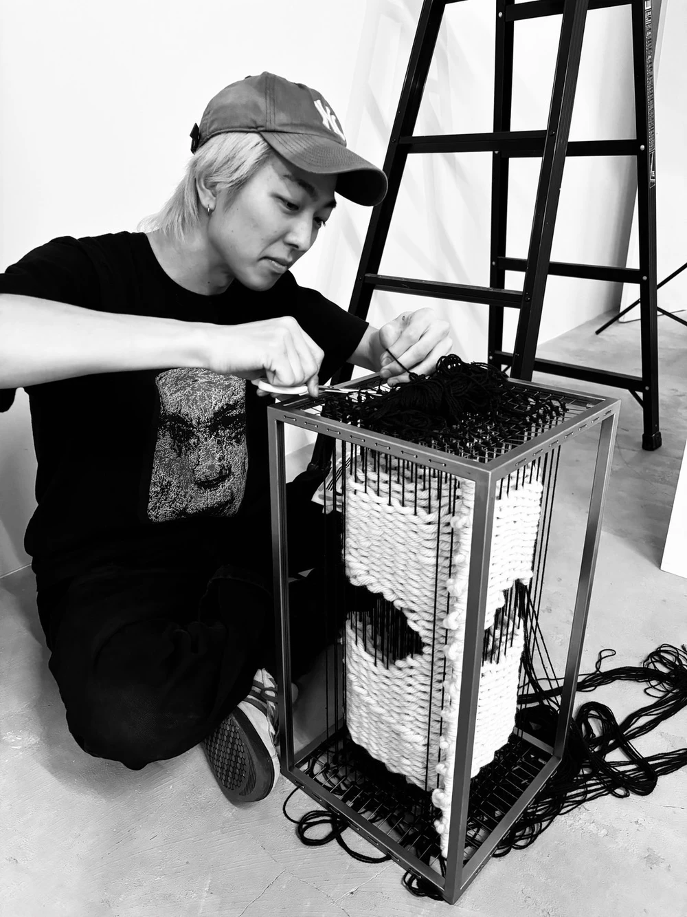 2000年生まれ。神奈川・東京都拠点。東京造形大学テキスタイルデザイン専攻を卒業。2024年4月に自身初となる個展をSOM GALLERYにて開催。黒瀧は、繊維が交差することで立体的な構造が生まれる織物の造形に着眼を得て、手作業を 通じた経糸と緯糸の組み合わせを用いた、立体作品を制作しています。 彼の代表作である、「Human」シリーズでは、規則的な糸の配置で構成されるフレームの中に人間を閉じ込めることで、パターン化された現代社会や人間の思考を浮き彫りにさせます。彼は自身の作品を通じて、空虚な現代社会や彼が捉える人間の視点を浮かび上がらせ、人々をアルゴリズムからの解放へと導くことを試みます。