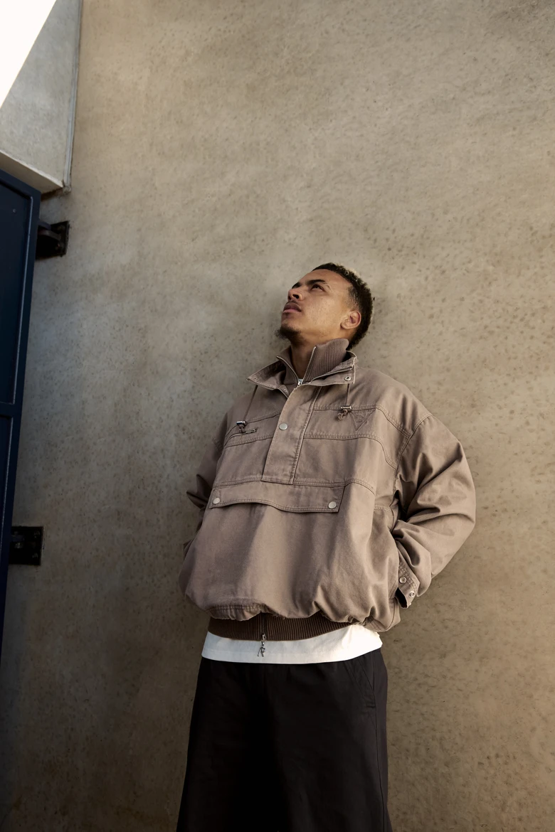 フロントポケットとハーフジップが印象的なツイル素材のアノラックジャケットや、胸元と背面にスクリプトロゴ刺繍を施したブラックボンバージャケットなどが、コレクションを象徴するアイテムである。上質なニット素材を採用したT7ジャケットは、トーナルなディテールとカスタムジッパープルが特徴で、ミニマルなパンツと合わせることでトータルルックを完成させている。