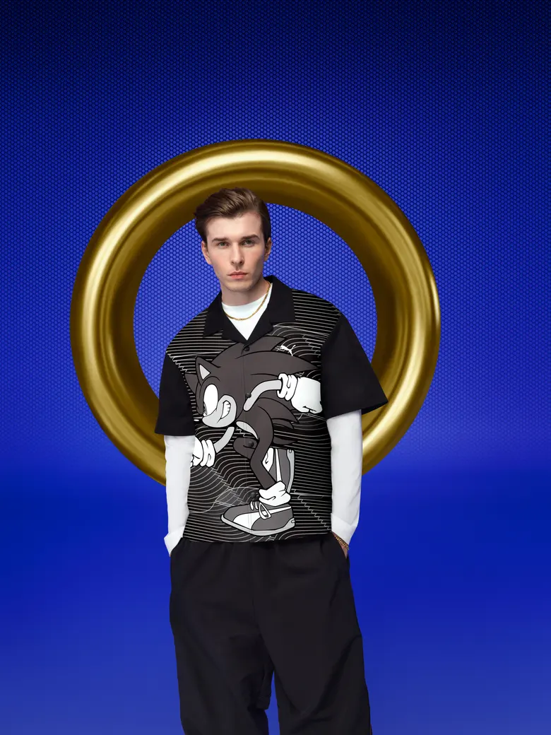 アパレルは、モータースポーツスタイルとゲームの世界観を融合。ブラックベースにレッドのラインを効かせたトラックジャケット&パンツ、ゴールドリングをモチーフにしたドローコード付きのフーディー&ショーツ、ソニックのビッググラフィックを大胆にあしらったレーサーシャツなど、多彩なアイテムが展開される。キャップやウエストバッグにはリングをイメージしたジッププルやダブルネームのバッジもデザインされている。