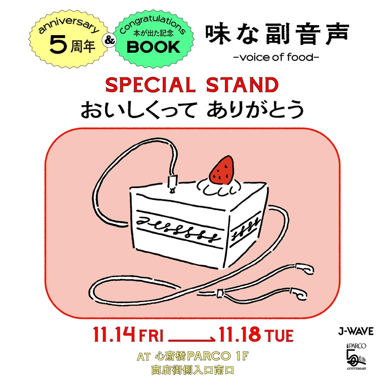 ラジオ局J-WAVE(81.3FM)が展開する、フードエッセイスト・平野紗季子が手掛ける人気ポッドキャスト・ラジオ番組『味な副音声 ~voice of food~』 。番組5周年を記念し発売された書籍『おいしくってありがとう 味な副音声の本』(河出書房新社)の刊行を記念し、スペシャルポップアップを開催いたします。
