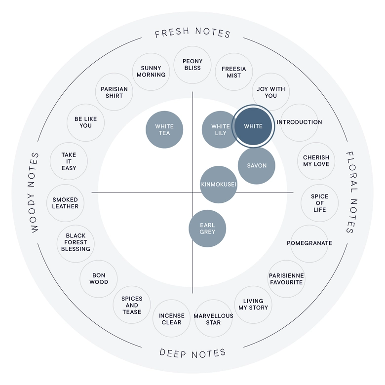 みずみずしいアップルやベルガモット、ホワイトティーが軽やかに香り立ち、ジャスミンやスズラン、ホワイトリリーが可憐に咲き重なる。ラストにはムスクとサンダルウッドが穏やかに広がる、清潔感のあるフローラルノート。