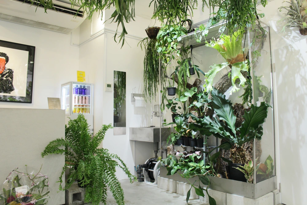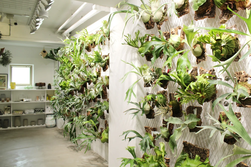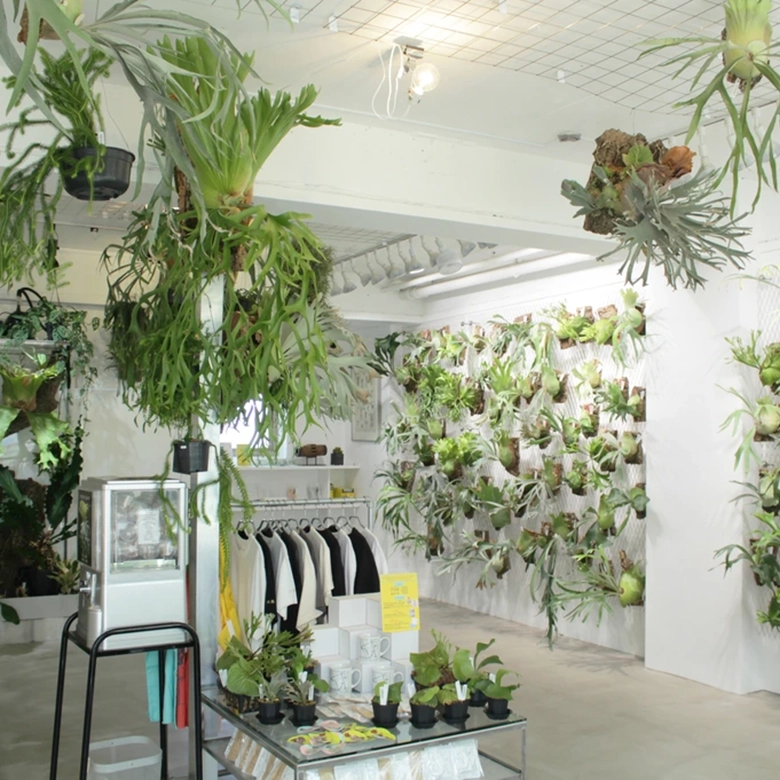 新店舗では、壁一面にかけられたビカクシダの多彩な品種が来店者を圧倒。希少種から普及種までを取りそろえ、シダ植物やアロイドなどの観葉植物も並ぶ。オリジナルグッズも充実し、空間全体がまるで植物のアートギャラリーのような佇まいを見せている。