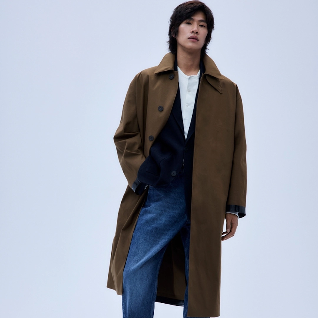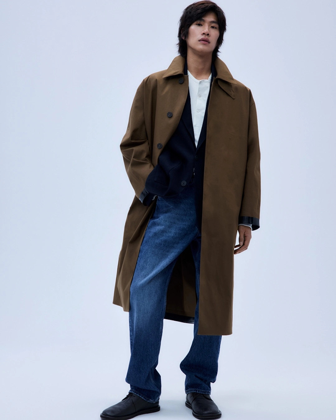 クラシックな膝丈のレインコートで、リラックス感のあるオーバーサイズフィットが特徴。ブラックとピート、ネイビーの3色展開で、タイムレスかつスタイリングしやすい一着に仕上がっている。