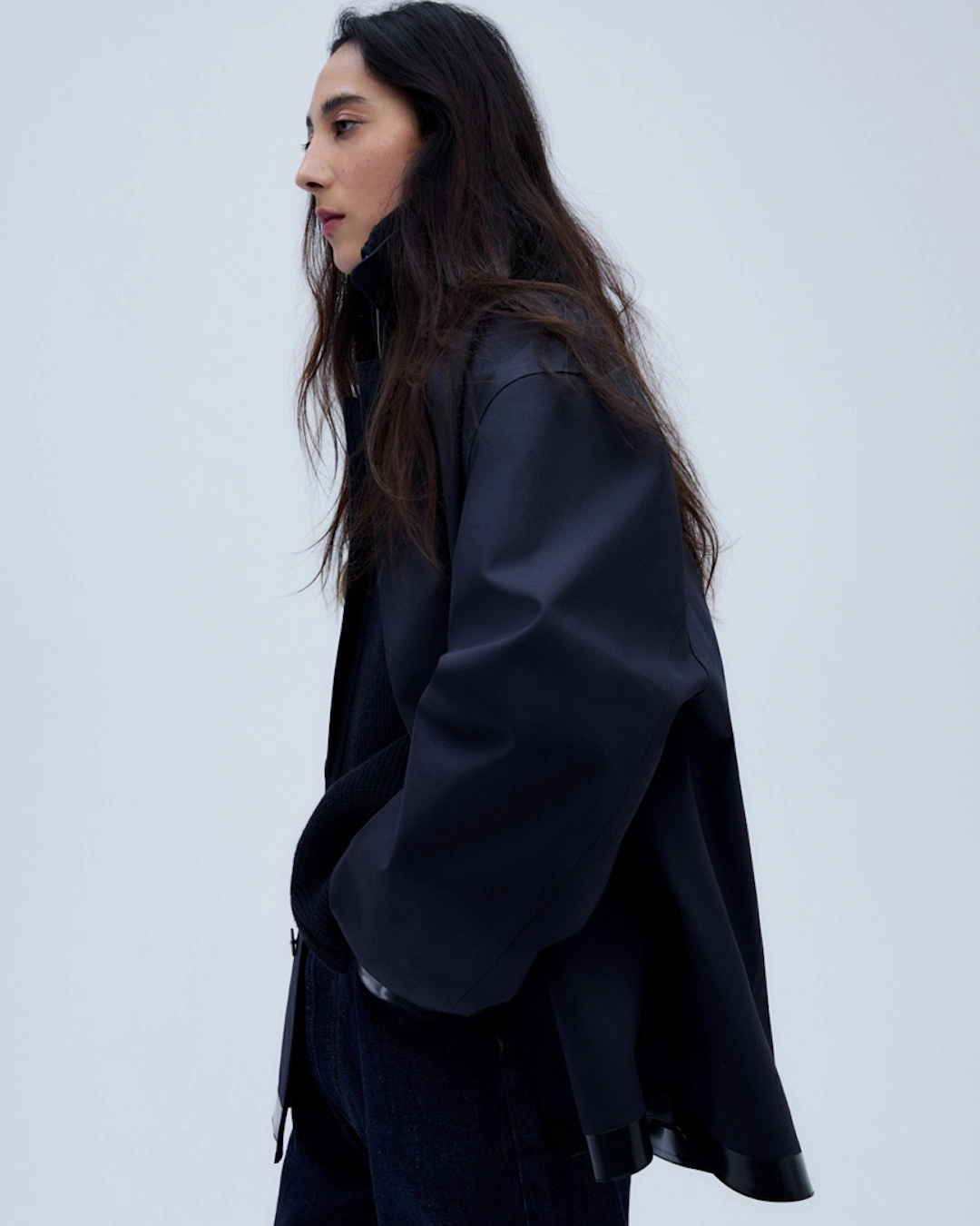 ウエスト丈でボリュームのあるシルエットが魅力のジャケット。ブラックとネイビーの2色展開。Ettrickコートの応用版ともいえるデザインで、テクスチャーのコントラストを効かせたブラックのテープ仕上げの裾が印象的。
