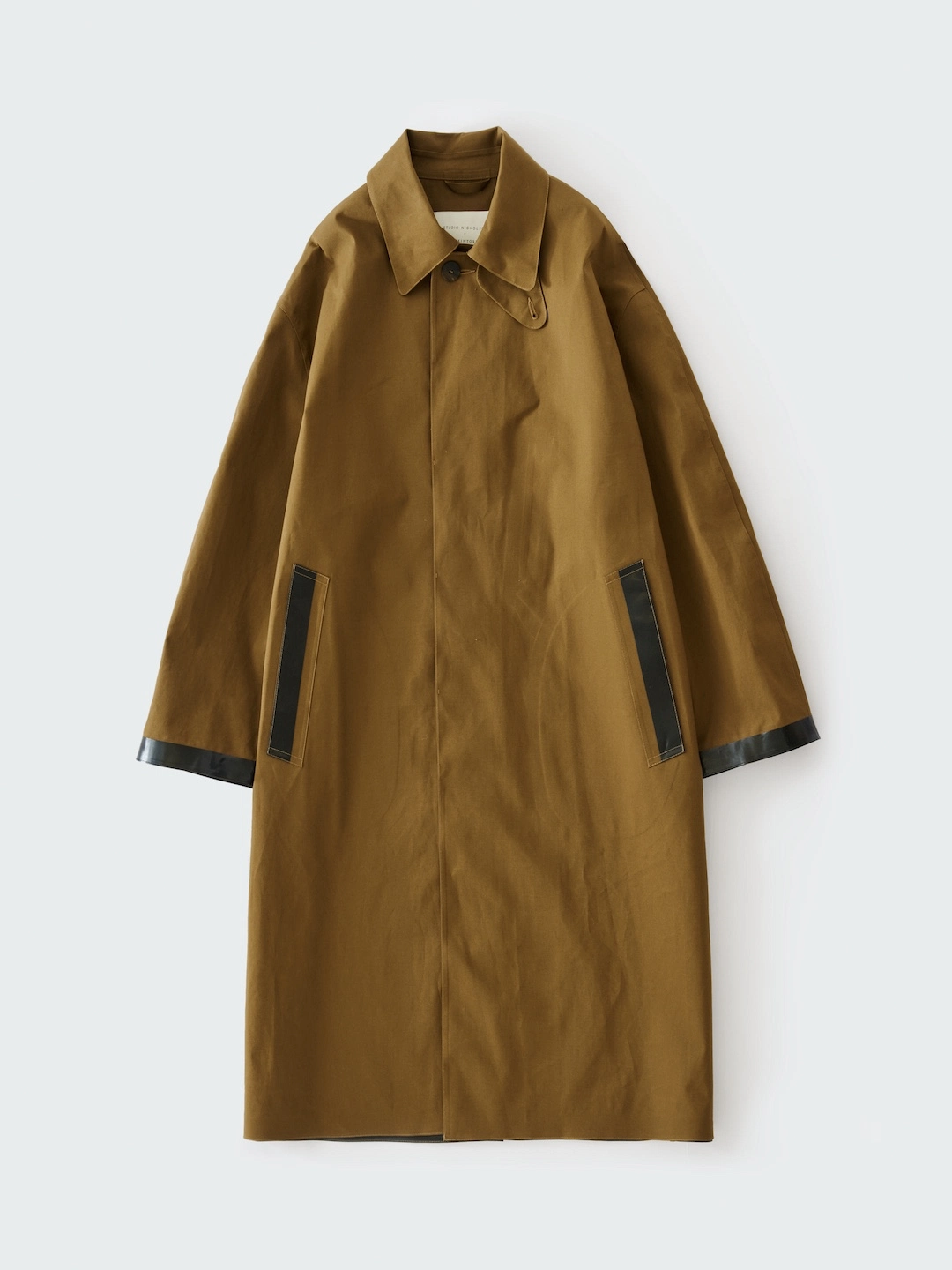 <STUDIO NICHOLSON>らしい建築的でボリュームのあるデザインを、<MACKINTOSH>の象徴的なゴム引きのボンディングコットン(高品質な綿を2層にし、間にラバーを挟んだ素材)で精緻に構築。高い機能性を持ち、完全防水で着用者を雨から守る。