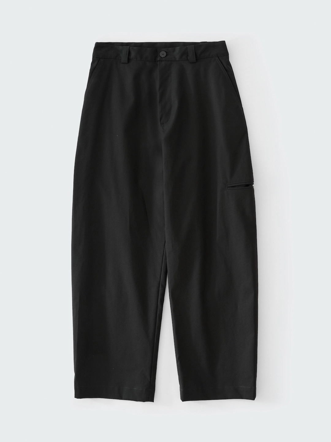 Mackintoshのラバー加工ボンディングコットンを使い、ブラックとネイビーの2色で展開。ゆったりとしたストレートレッグで、腿部分には隠しスリップポケット付き。