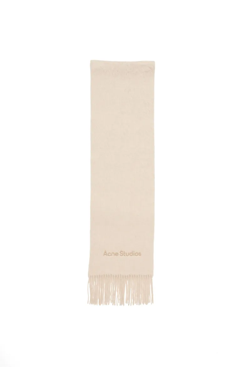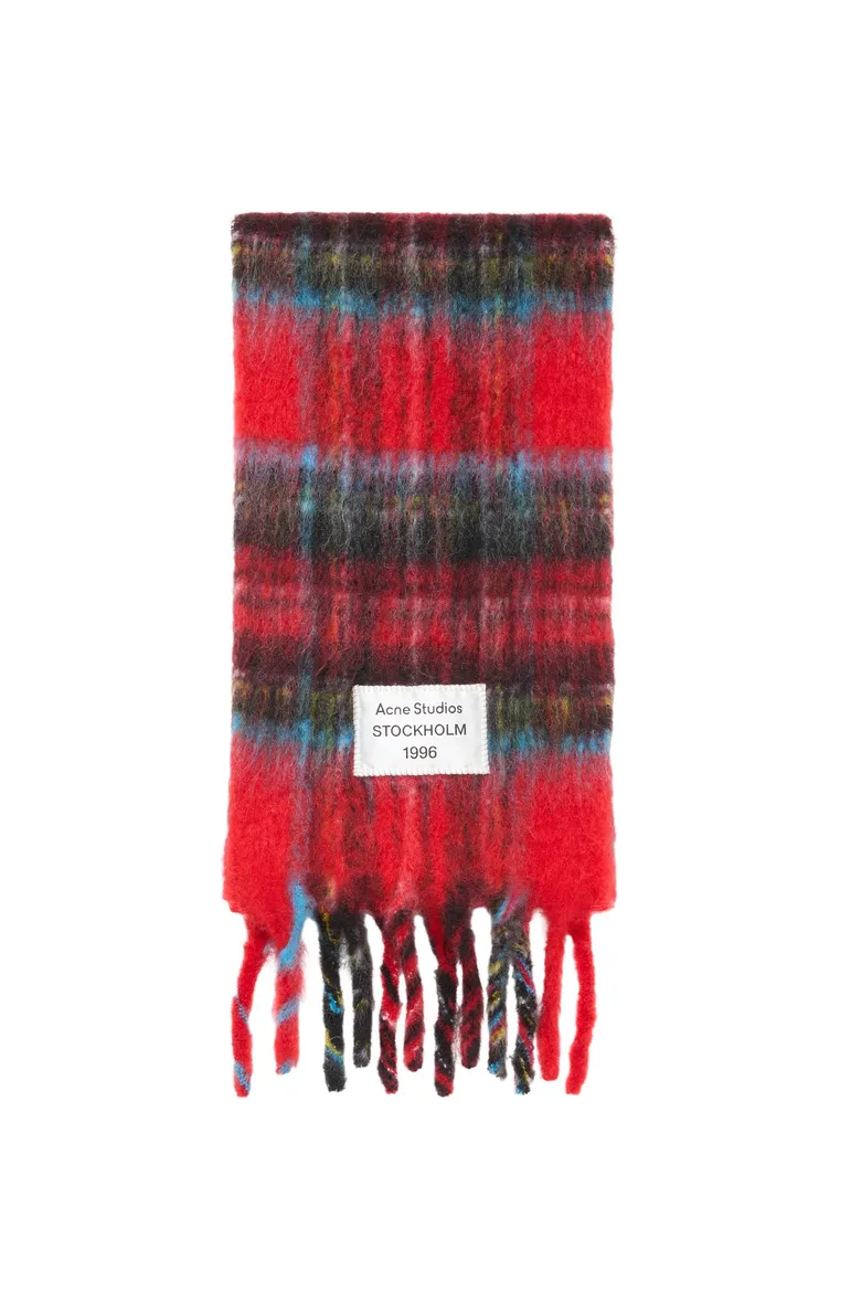 特徴:柔らかなモヘアを使用したスカーフで、ふんわりとした風合いと温かみのある肌触りが魅力。シーズナルなチェック柄、縁のフリンジ、<Acne Studios>レザーロゴラベルのディテールが特徴。