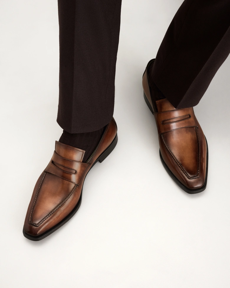 1960年代からメゾンを代表するアイコン的存在であるローファー〈アンディ〉は、独自のパティーヌ技法により一足ずつ丁寧に仕上げられている。ハイヴァンプ、大胆なライン、スクエアタン、手縫いのエプロンが特徴で、贈り物としても抜群の存在感を放つ。