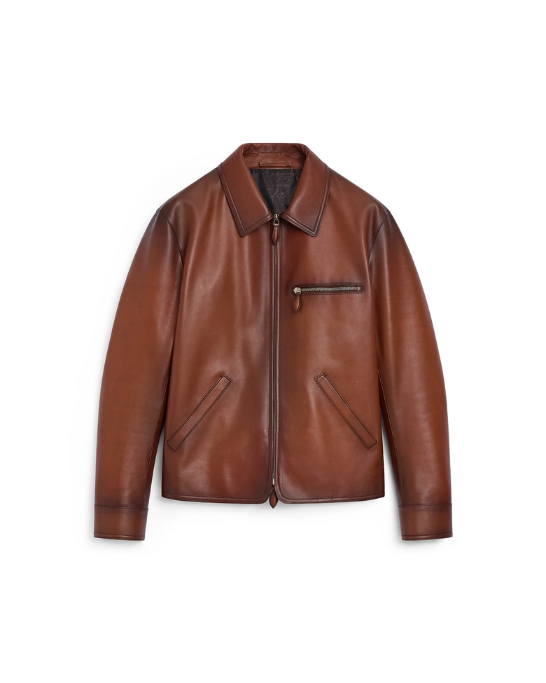 <Berluti>の象徴的なバッグ〈アンジュール〉に着想を得たレザージャケット。スタンドアップカラーのブルゾン風モデルと、スナップダウンラベル付きのバイカージャケットの2型を展開する。マーロン・ブランドやジェームズ・ディーンを彷彿とさせるクラシックなムードに、現代的なエッジを加えた一着だ。