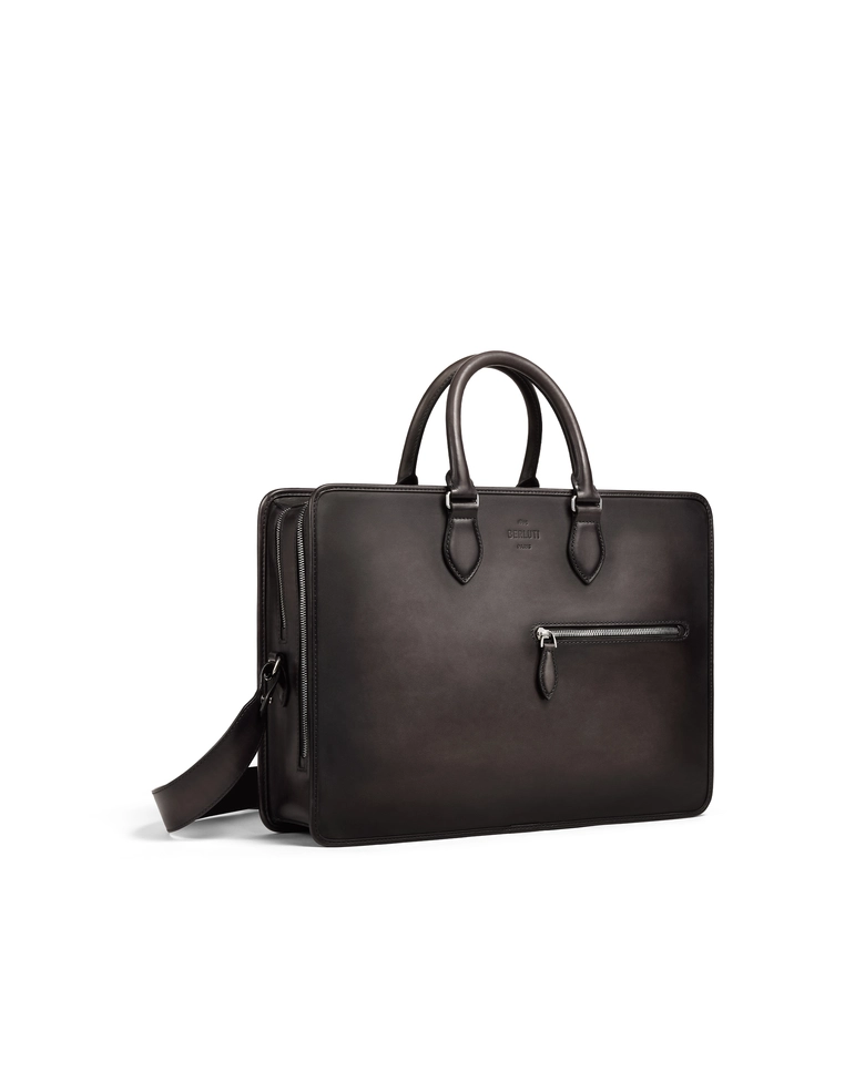 短期旅行からビジネスまで対応する、<Berluti>のアイコンバッグ。2つのハンドルに加え、ショルダーやクロスボディにも対応可能なストラップ、小物用ポケット、仕分けに便利なコンパートメントを備え、エレガンスと機能性を両立している。