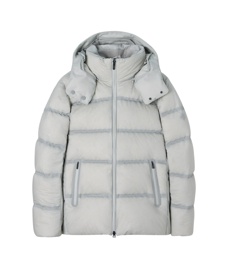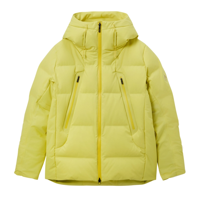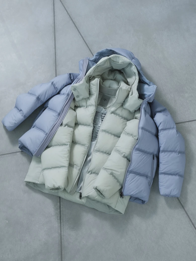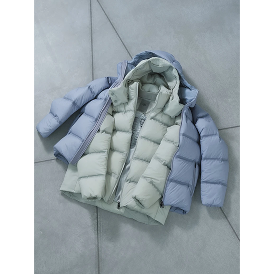 <水沢ダウン>のこだわりが詰まった内側の設計を視覚的にも表現するため、表地には12dの薄くて軽量、かつ優れた耐水性を備えた素材を使用。さらに、その透け感が、デザインに奥行きを与えている。中綿には、圧倒的な軽さと嵩高性を誇る1000フィルパワーのダウンを充填し、まるで空気をまとうような着心地と抜群の暖かさを実現した。