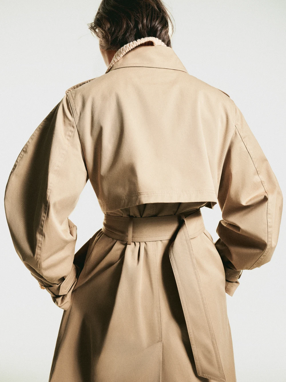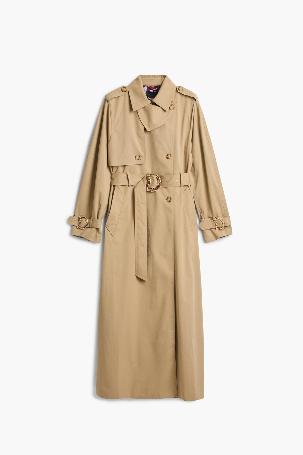 ・コンテンポラリートレンチコート:<Desigual>の「D」をかたどったトリミングと、アート性の高いプリントライニングが際立つ建築的デザイン