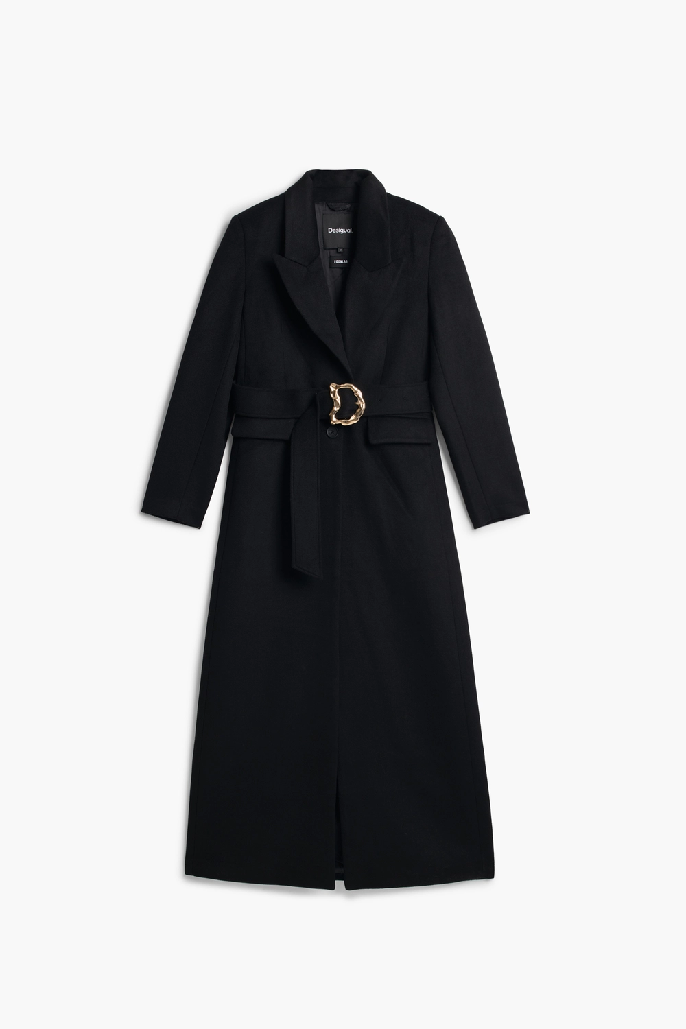 ・ウールコート:重厚な仕立てに、ゴールドの「D」型メタルベルトがアクセントを加える彫刻的フォルム