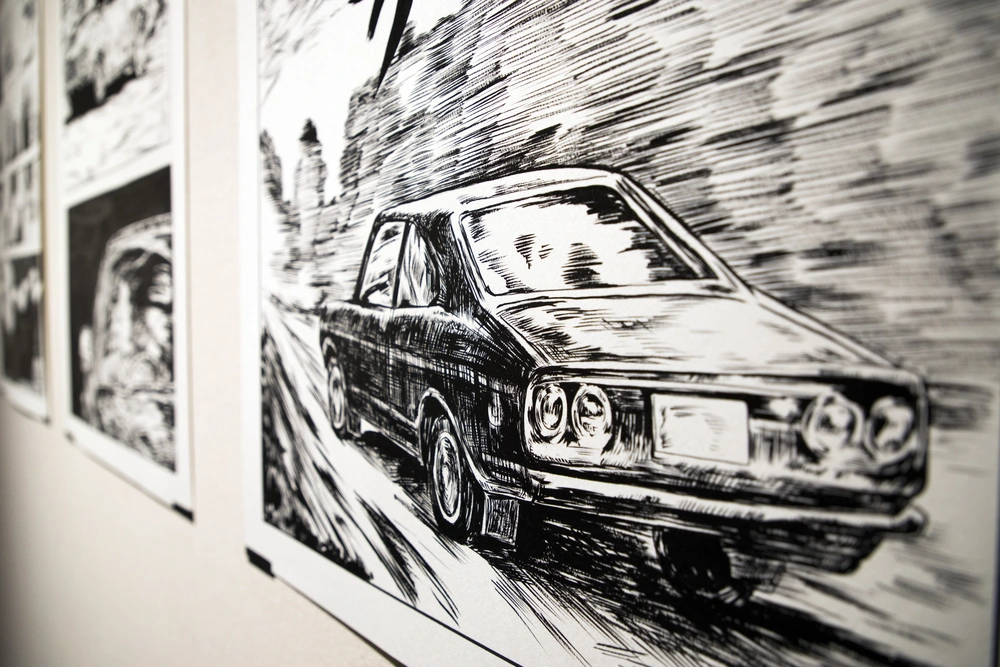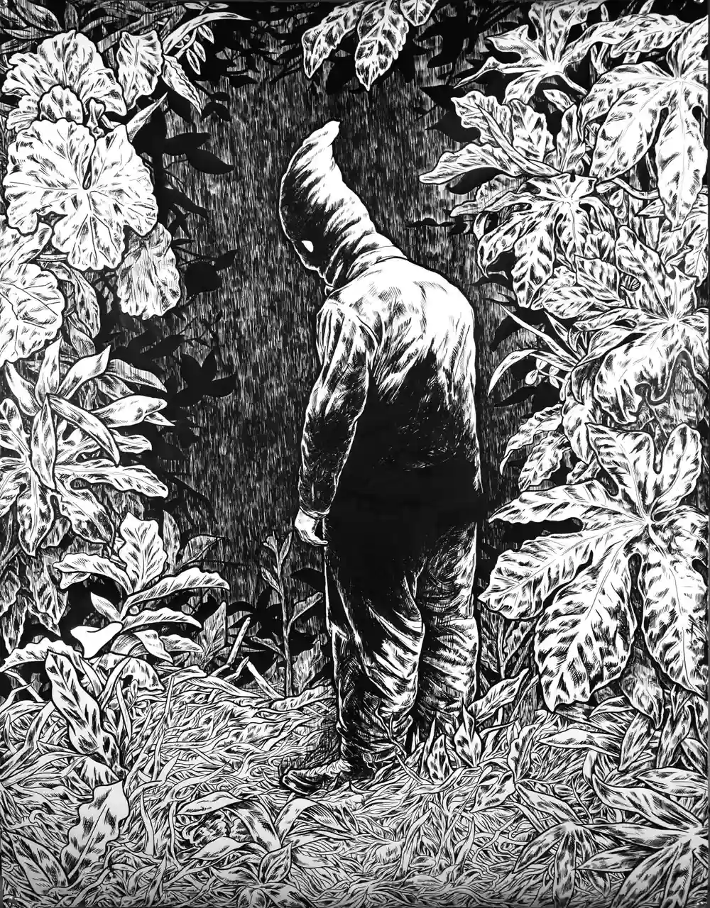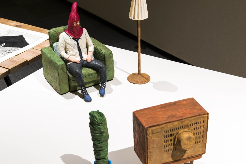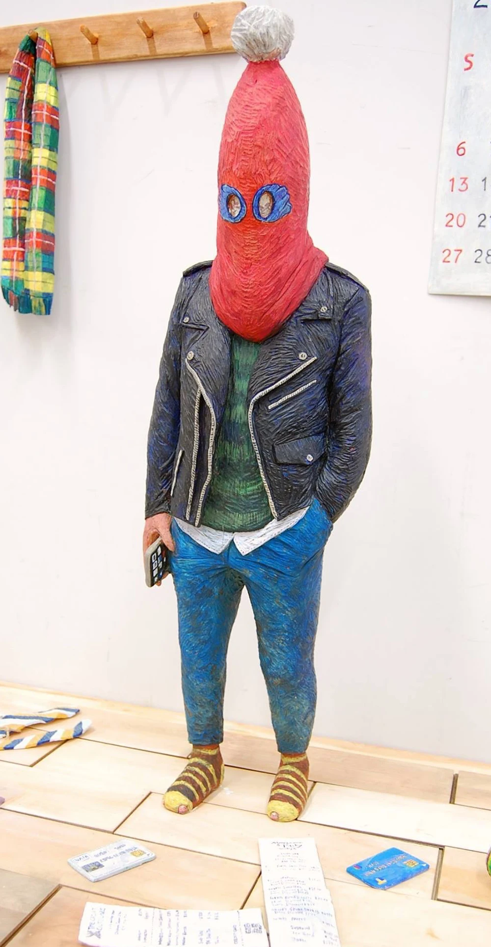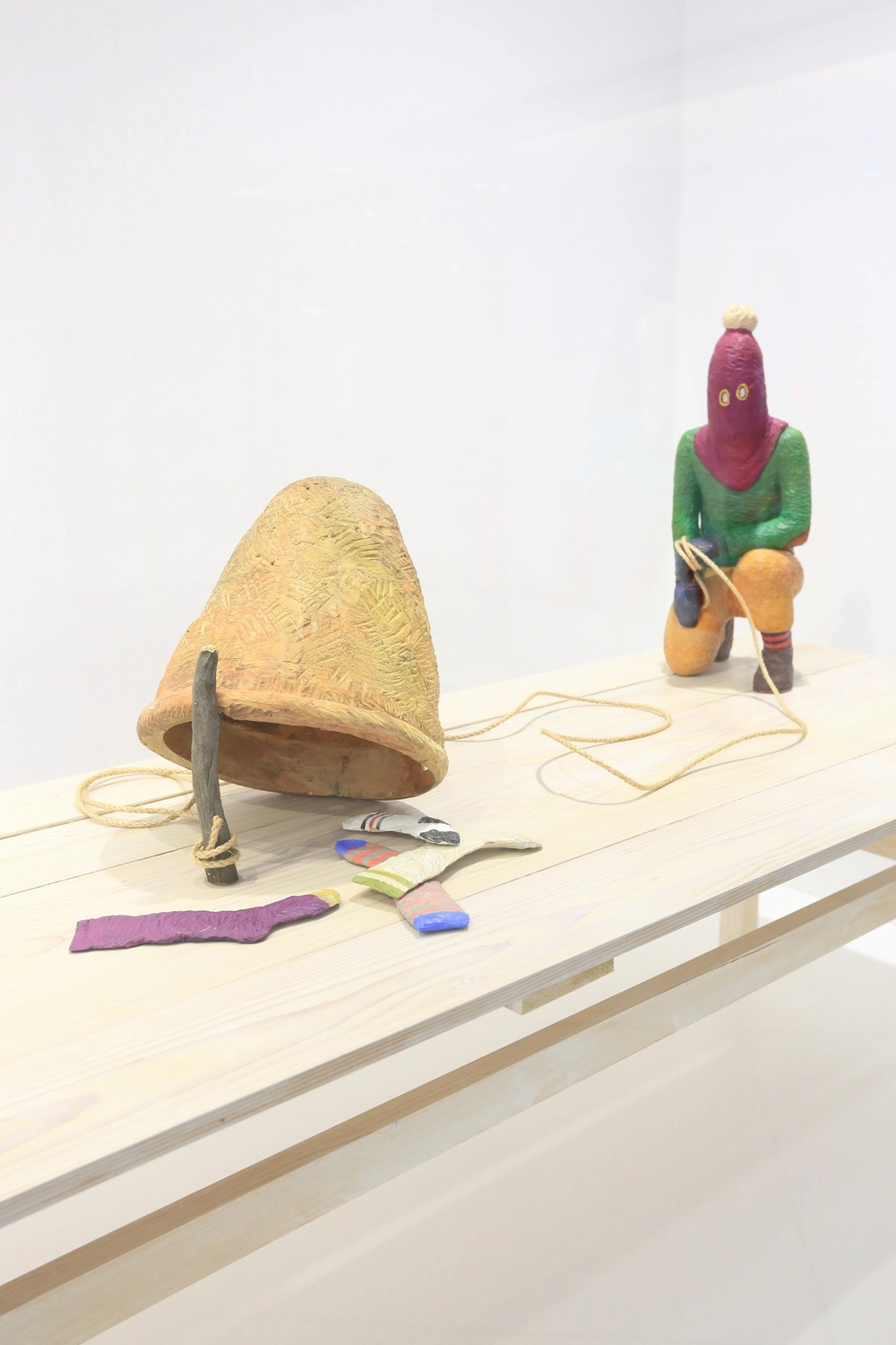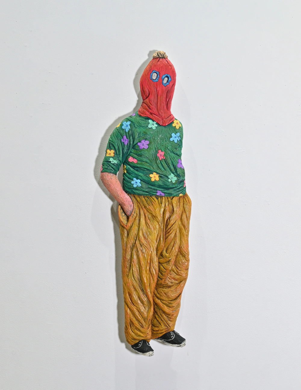 尾花は、風景や人の営み、歴史、伝承といった土地に根ざしたモチーフをもとに、ドローイングや彫刻を展開する作家だ。登場人物の多くは、マスクをかぶったどこか冴えない端役たち。悪役のようでもあり、しかしどこかユーモラスでもあり、彼らの素顔は語られない。ただ、仲間と静かに笑い、涙し、怒り、そしてそれぞれの小さな充実感を胸に日常を生きている。そんな彼らの姿に、観る者はふと自分自身を重ねる。