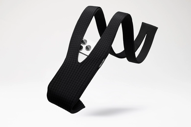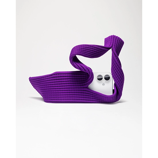 「iPhone Pocket」は、<ISSEY MIYAKE>によるオリジナルのプリーツ素材に着想を得たリブ編みのオープン構造が特徴。アウトフィットにもう一つポケットを加えるというアイデアから生まれた、その飾らないデザインは、iPhoneを完全に包み込み、さらに日用のアイテムが入るように伸縮して広がる。広げると、編み地の開いた部分からわずかに中のものが見え、iPhone のディスプレイが現れる。