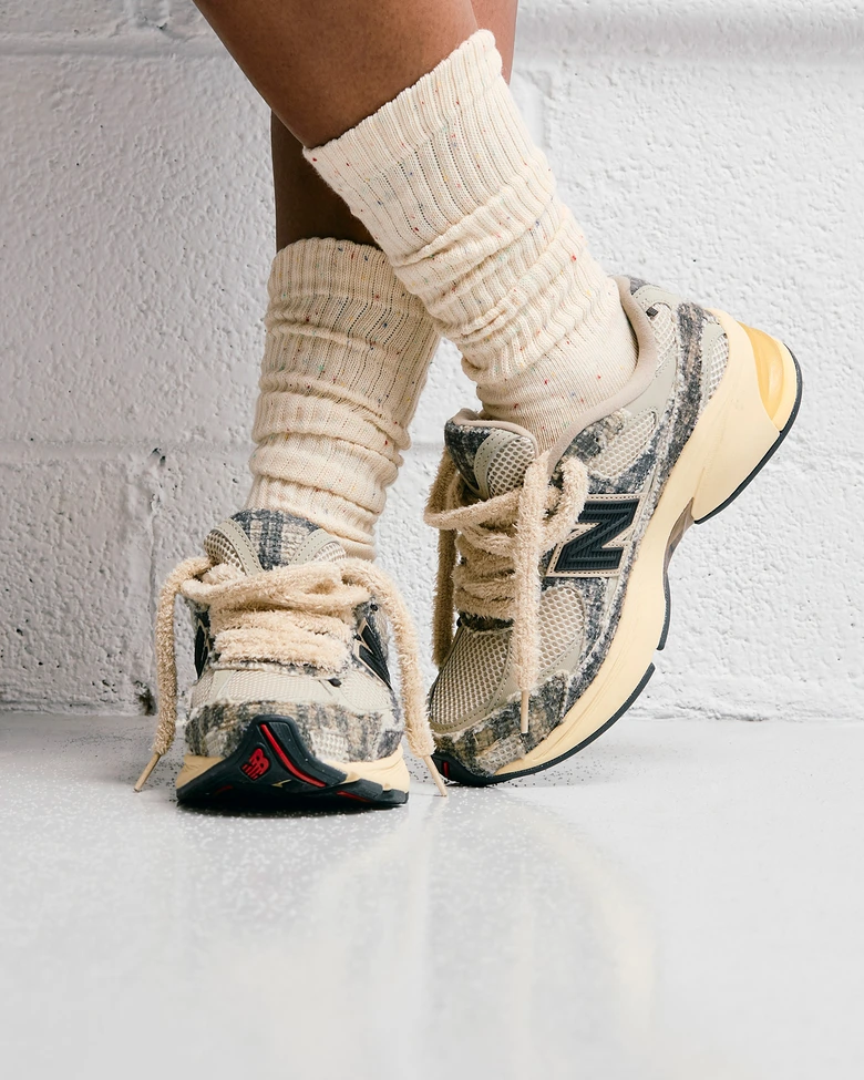 今回のモデルは、“個性による自信の現れ方”をテーマに掲げ、クラシックなランニングシューズのディテールに現代的な素材とテクスチャーを掛け合わせた実験的デザインが特徴。アッパーにはプリントを施したブークレ素材を使用し、柔らかく使い込まれたような質感を表現。ダイヤモンドニット構造のメッシュアンダーレイと組み合わせ、クラシックとモダンを横断するデザインに仕上げられている。さらに「JFG」のチャームがついた着脱可能なメタルチェーンを備え、カスタマイズ性の高さも魅力だ。