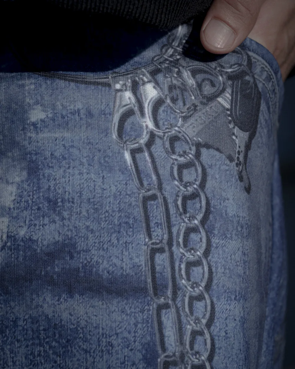 ヴィンテージデニムのダメージ感やグラフィックをそのまま転写し、ラフな穿き心地ながら存在感を放つ一本。