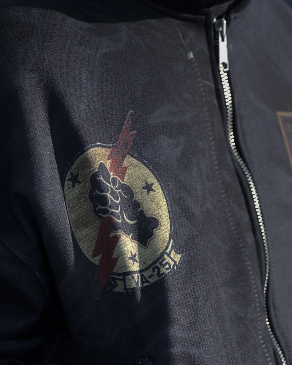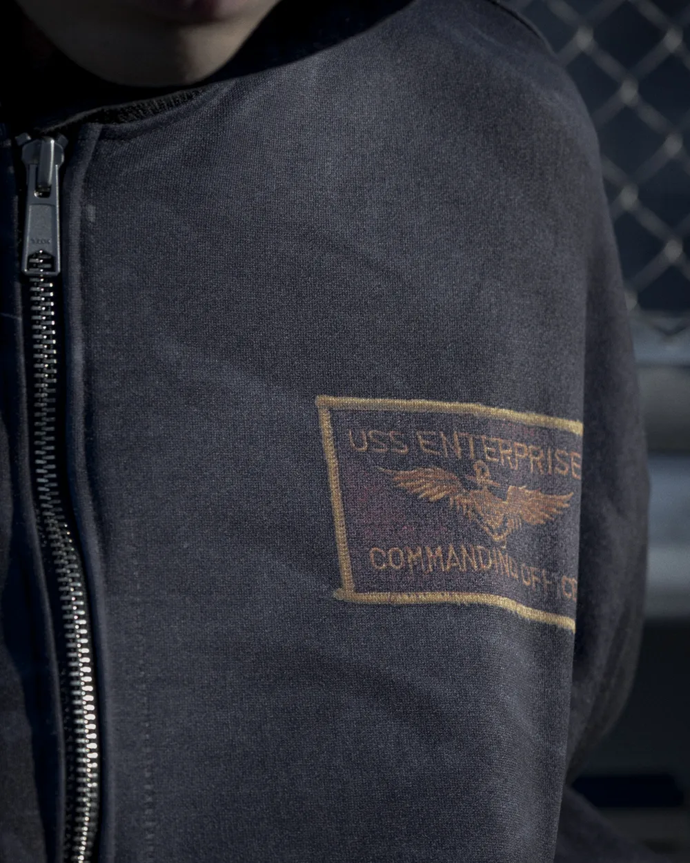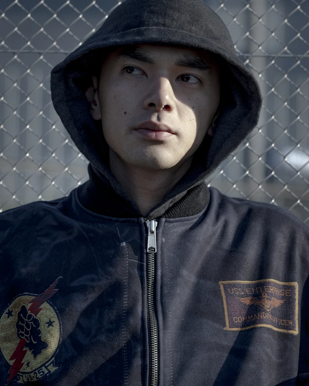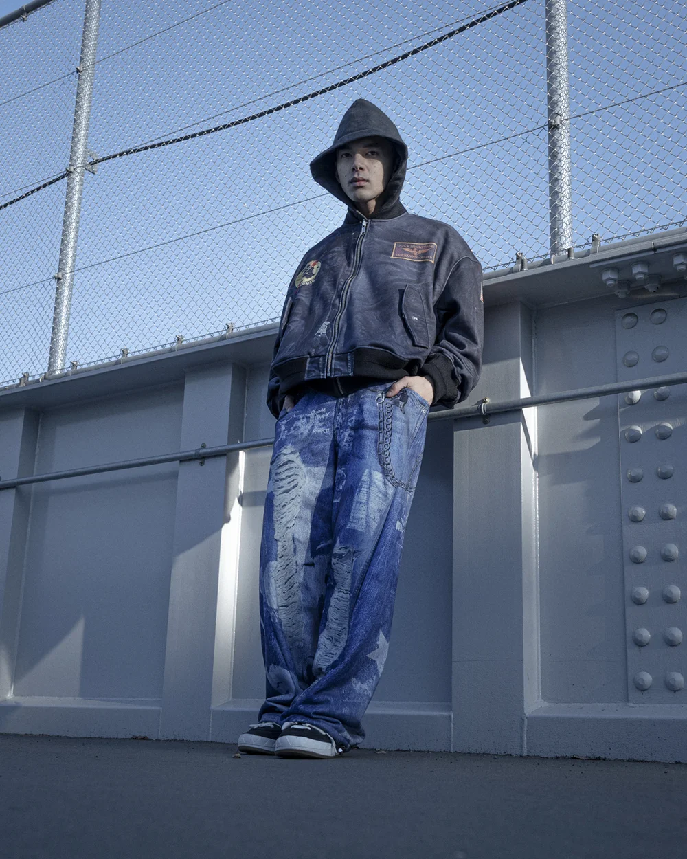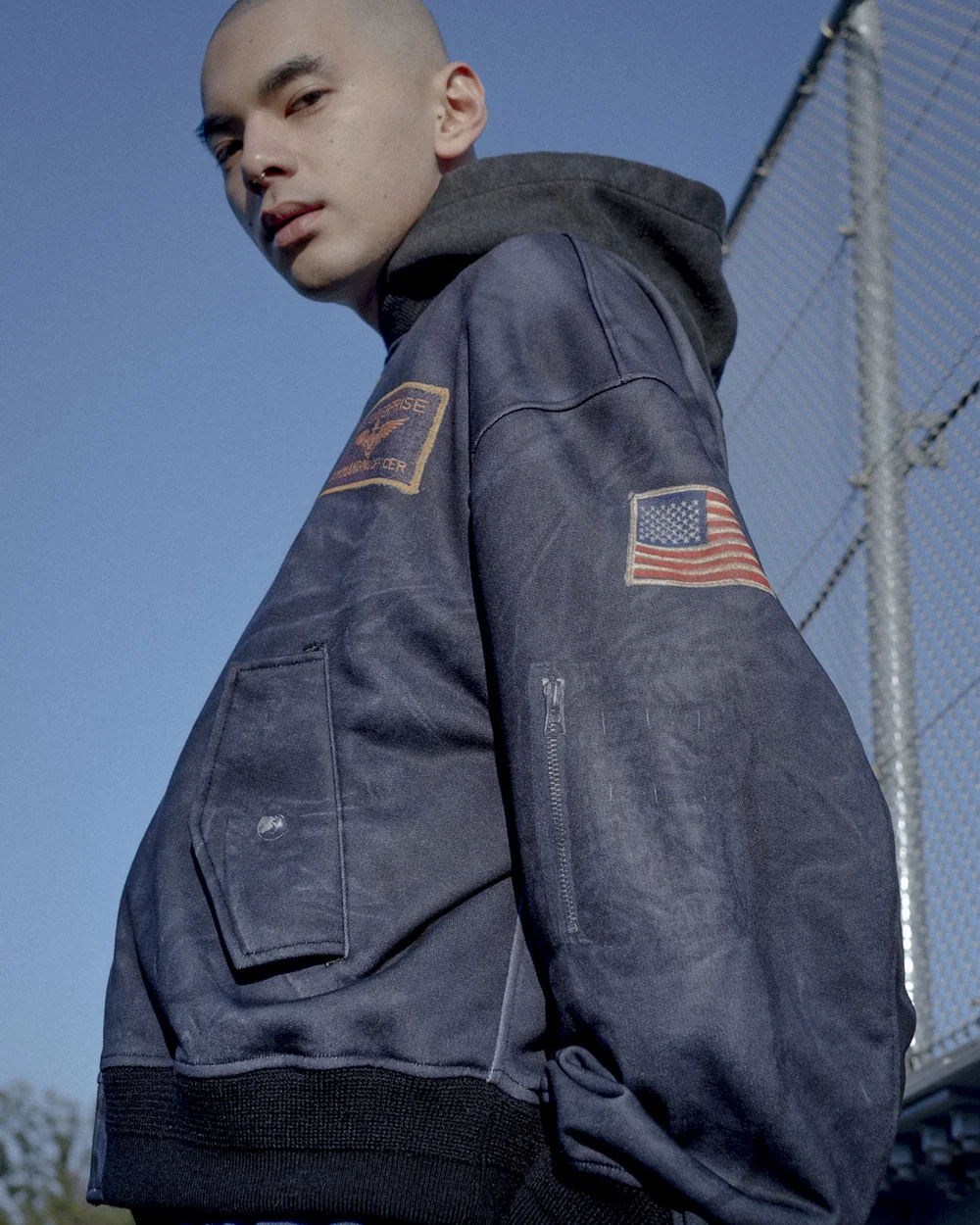 MA-1を模したブルゾン。実際はスウェット素材だが、光沢感や立体感のあるディテールを転写加工でリアルに再現。