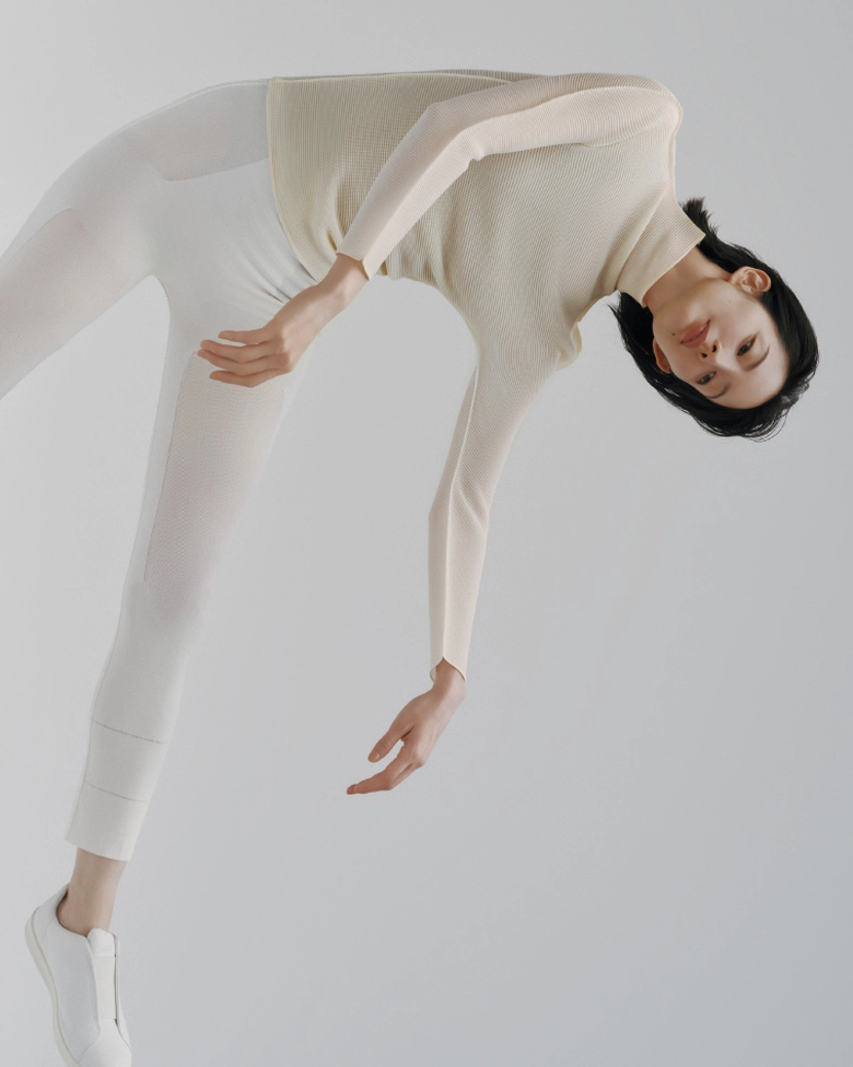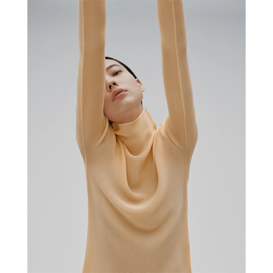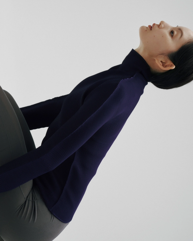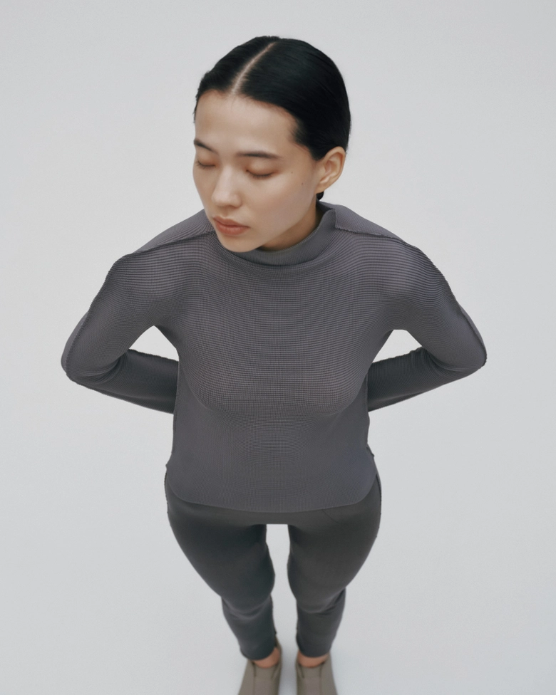 また、<me ISSEY MIYAKE>ではブランドの代表素材であるストレッチプリーツの新たな魅力を、さまざまなビジュアルで毎シーズン提案しており、今回のビジュアルでは、“わたし”の身体の動きに寄り添うストレッチプリーツのシルエットが、グラフィカルに表現されている。