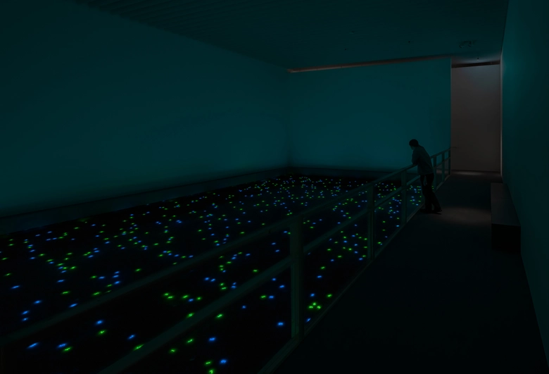 LEDの光が変化を続けるように、記憶もまた未来へと流れ続けている。その“時”の海に、宮島のまなざしが重なる。