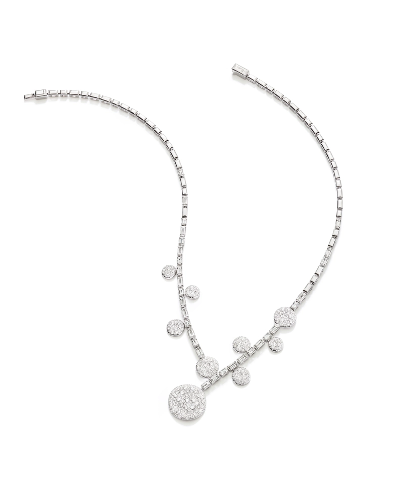 ハイジュエリーでは、ホワイトゴールドをキャンバスに、バゲットは爪留め、ブリリアントはイレギュラーパヴェという異なる技法で融合。光が織りなす幻想的な風景を表現するイヤリングとネックレスが登場する。メインピースとなる新スタイルのネックレスは、クラシックなテニスネックレスに着想を得て、連続するダイヤモンドと直線的なラインを現代的に再解釈。しなやかで首元になじむ造形と、大小の「サッビア」ディスクをあえて不均等に配したバランスが際立つ。