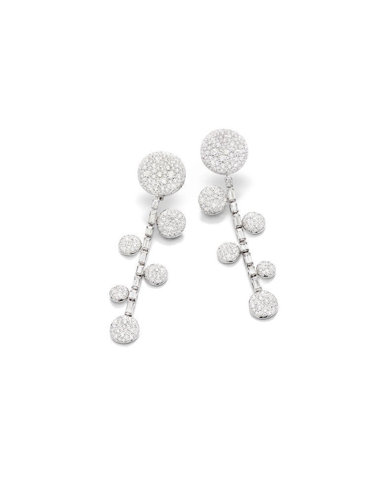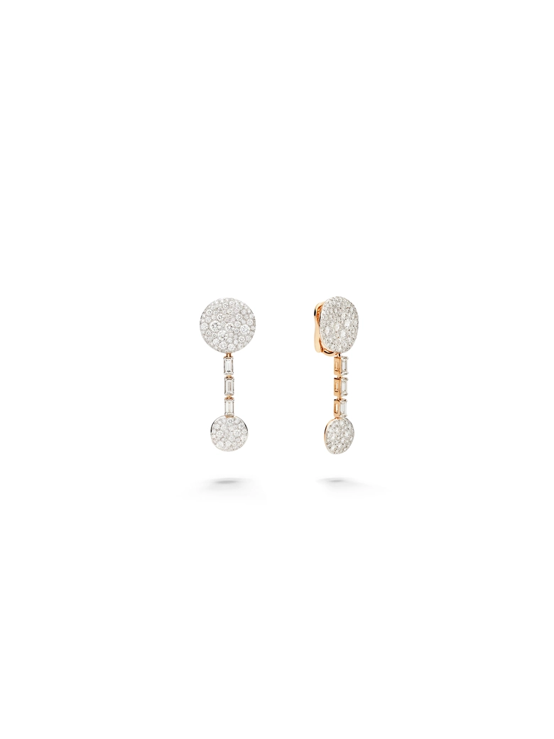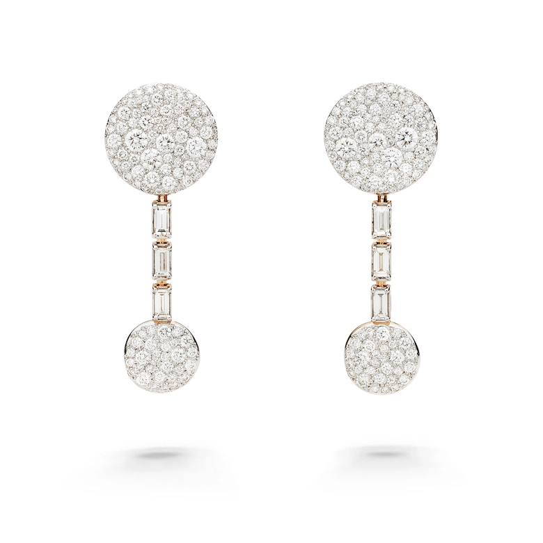 同モチーフのペンダントイヤリングは、ディスクとバゲットのリズムが軽やかな動きを生み、耳元に繊細な輝きを添える。