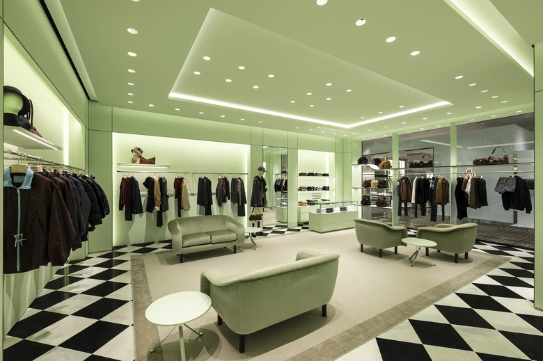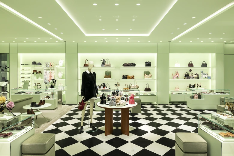 展開商品は、レディスのウェア、レザーグッズ、シューズ、アクセサリーとフルラインアップを取り揃え、<PRADA>の美学を体現する洗練されたショッピング体験を提供する。