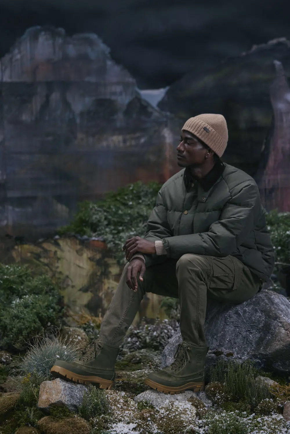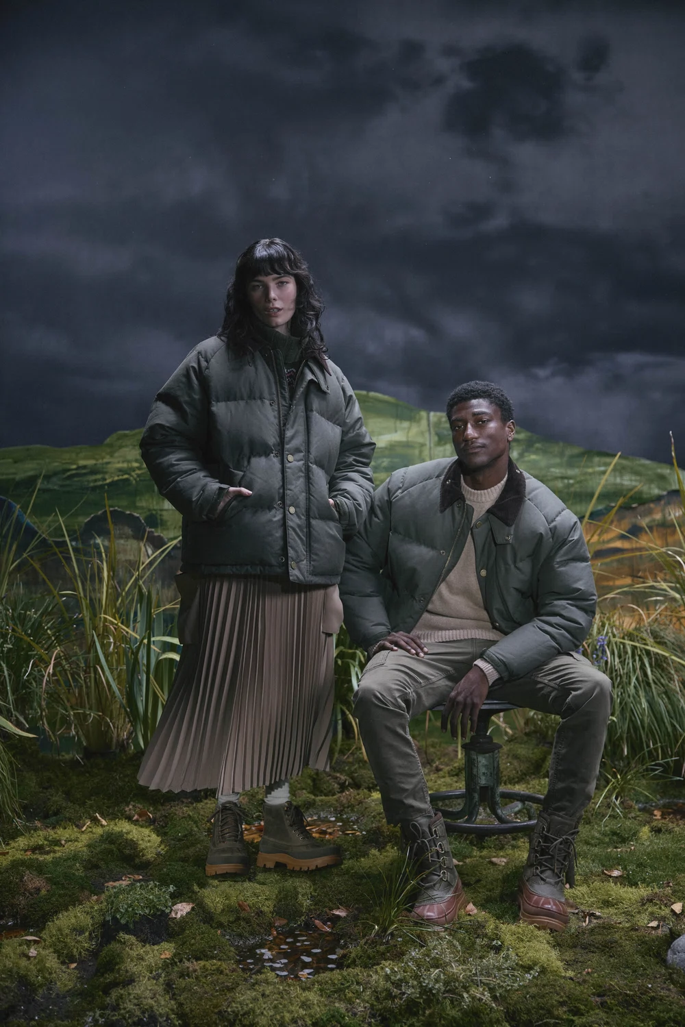 本コレクションは、<SOREL>が今秋冬に展開する新作「Horizonシリーズ」をベースに、タフな機能性と<Barbour>の英国らしい品格を融合した3型のフットウェアが中心。いずれもGORE-TEXの防水性やVibramアウトソール、フルグレインレザーなど本格的な仕様を搭載しながら、グリーンやブラウンを基調とした落ち着いたカラーやタータン柄など、<Barbour>らしいディテールが散りばめられている。さらに、<Barbour>の定番“Transport”ジャケットをベースに、ワックスコットン×ダウンで仕立てたアウター「Transport Down Puffer」も登場。街でもアウトドアでも活躍できる、軽さと保温性を兼ね備えた一着に仕上がっている。