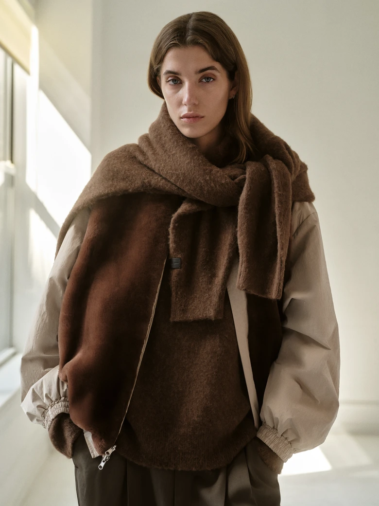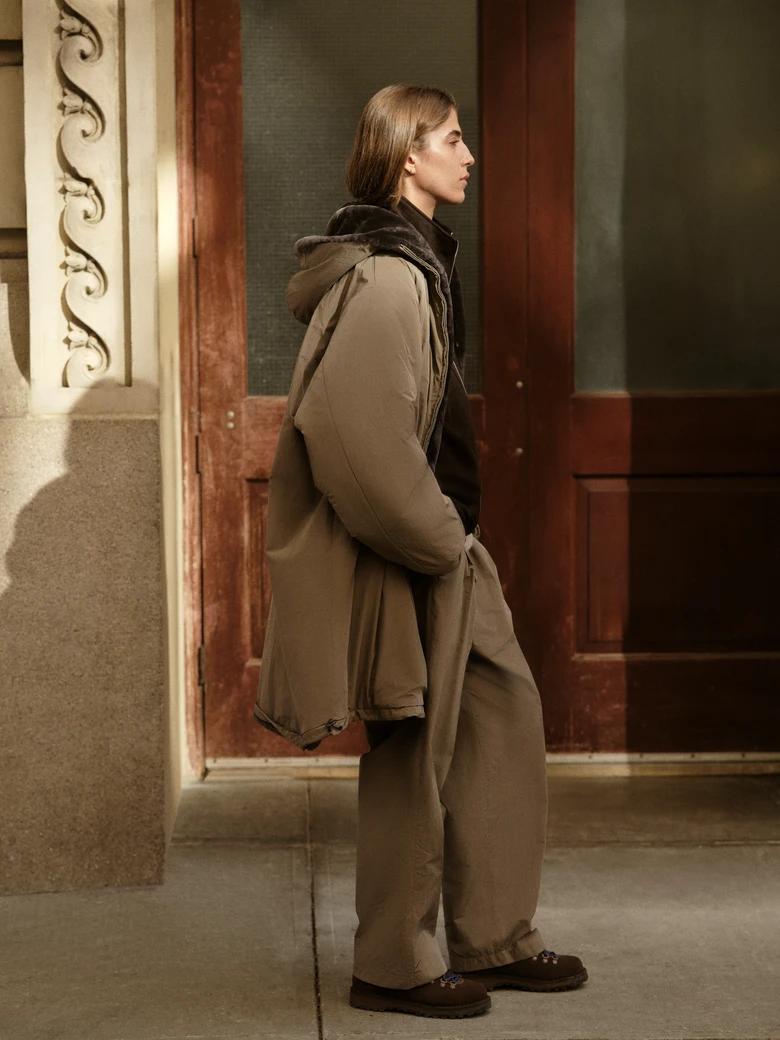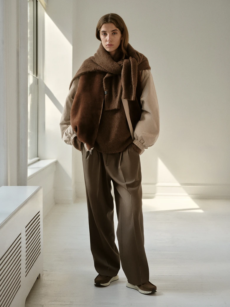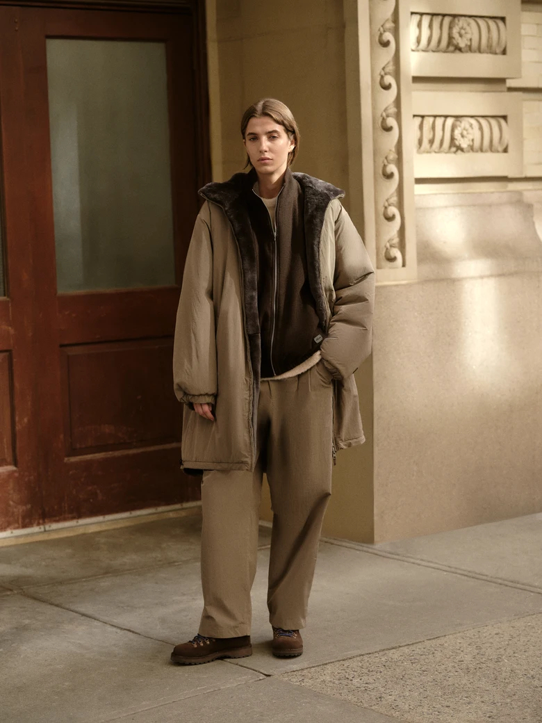 <ssstein>が得意とする素材開発力と、<Kith>のモダンで洗練されたシルエット構築を融合。テクニカルなファブリックと上質なウール、ニットの質感を掛け合わせたアイテム群を展開する。カラーパレットはウォルナット、エバーグレーズ、キンドリングといったアーストーンを基調に、ブライトホワイトやブラックビューティを差した落ち着きのあるトーンで構成。