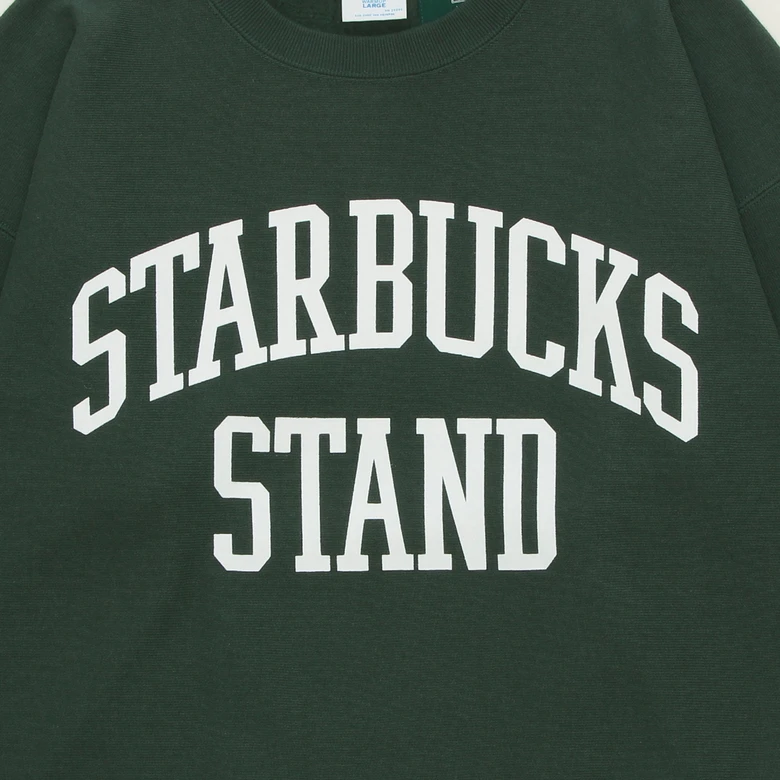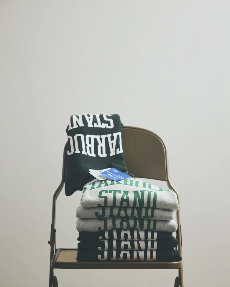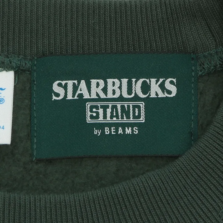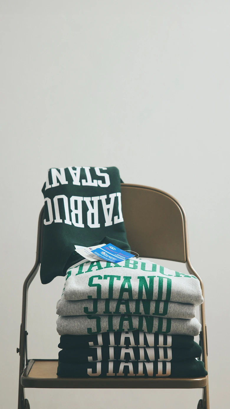 デザイン面では、カレッジ風フォントによる「STARBUCKS STAND」のフロントプリントが目を引き、右袖には<STARBUCKS STAND by BEAMS>のレザーロゴパッチを配置。クラシカルでありながら新鮮さを感じさせる特別な一枚となっている。