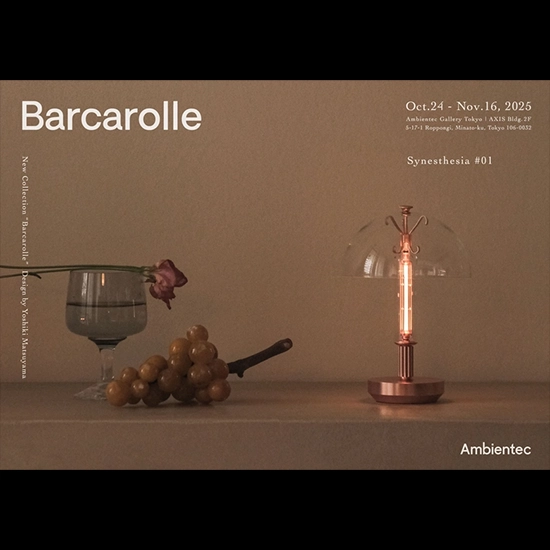 展示空間では、この「Barcarolle」の灯りに呼応するように、香りに<FUEGUIA 1833(フエギア イチハチサンサン)>のセレクションを、音楽にベルリン拠点の作曲家フェリックス・ロシュの楽曲を採用。視覚・嗅覚・聴覚が重なり合い、五感で灯りを感じるような体験が広がっている。