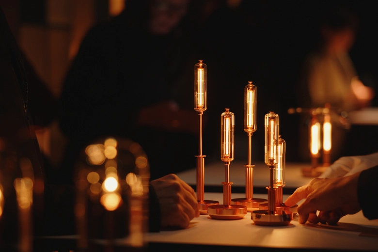メインとなる「Barcarolle」は、デザイナー松山祥樹が手がけたポータブル照明。舟唄を意味するその名の通り、ヴェネツィアの水辺にきらめく光の情景から着想を得ている。複数を並べて点灯させると、まるで水面に浮かぶ光の粒が空間に立ち上がるような情緒的な景色が生まれる。