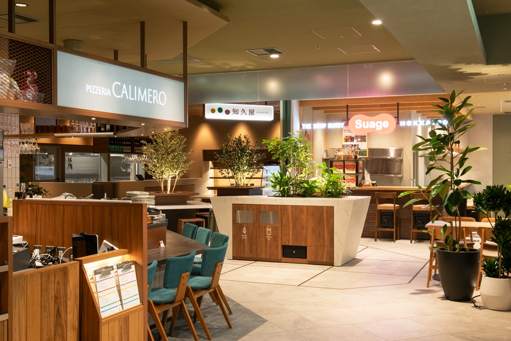 ランチ・カフェ・ディナー・バータイムまで幅広く対応。中央には共用席、テラス席、専用席を設置し、昼は263席・夜は306席が利用可能。空間全体は整えすぎず活気とリラックスが共存する設計で、訪れるたびに新しい発見があるようなレイアウトとなっている。