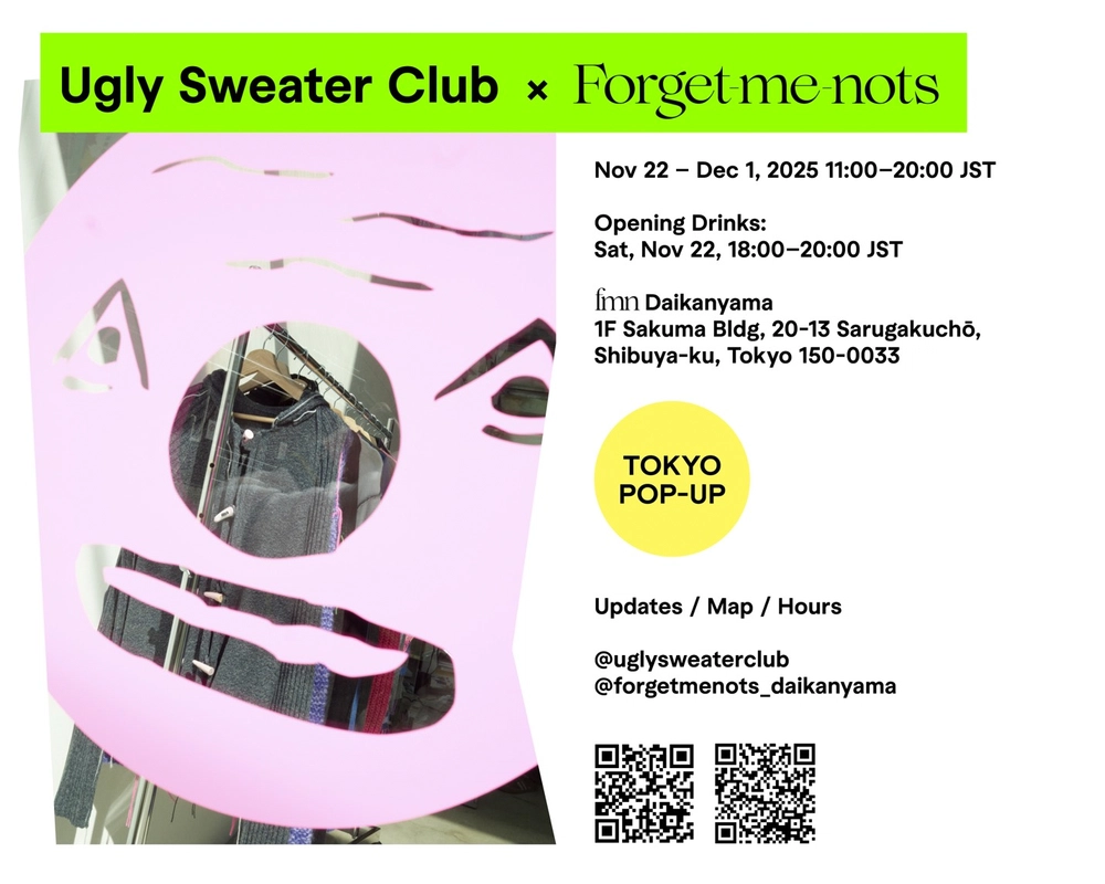 ポップアップ初日の11月22日(土)にはレセプションも開催。新作アイテムに加え、ビールやソフトドリンクも用意される。ブランドのユーモアとクラフトマンシップが詰まった空間で、<Ugly Sweater Club>の“完璧じゃない可愛さ”をぜひ体感してみてほしい。