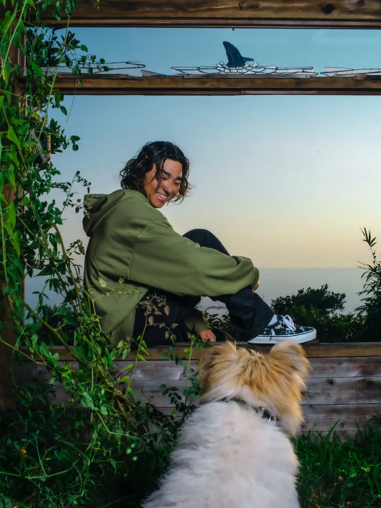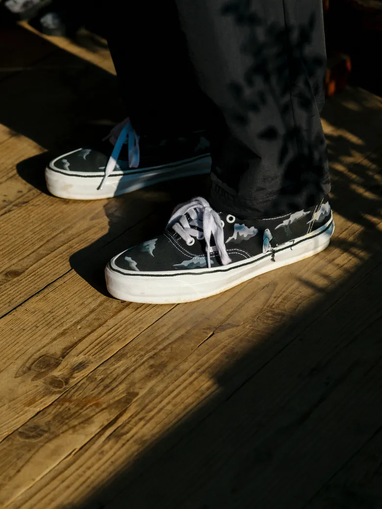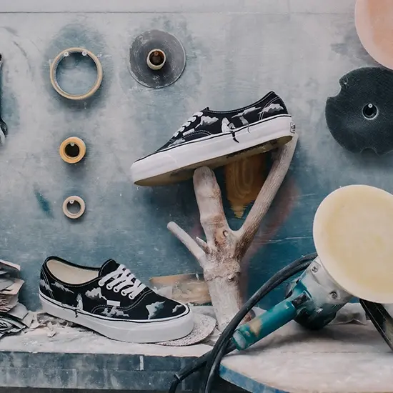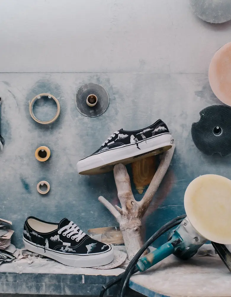 シューズは、サーフカルチャーを象徴する「オーセンティック」モデルをベースに、たなびく雲とそれを見つめる人物と猫のモチーフをアッパーとフォクシングテープにプリント。手描き風のフォクシングラインやクリアラバーアウトソールを通じてアートが透ける仕掛けも見どころだ。インソールには30%バイオベースの高反発ポリウレタンフォーム「SOLA FOAM ADC」を搭載し、快適な履き心地を提供する。