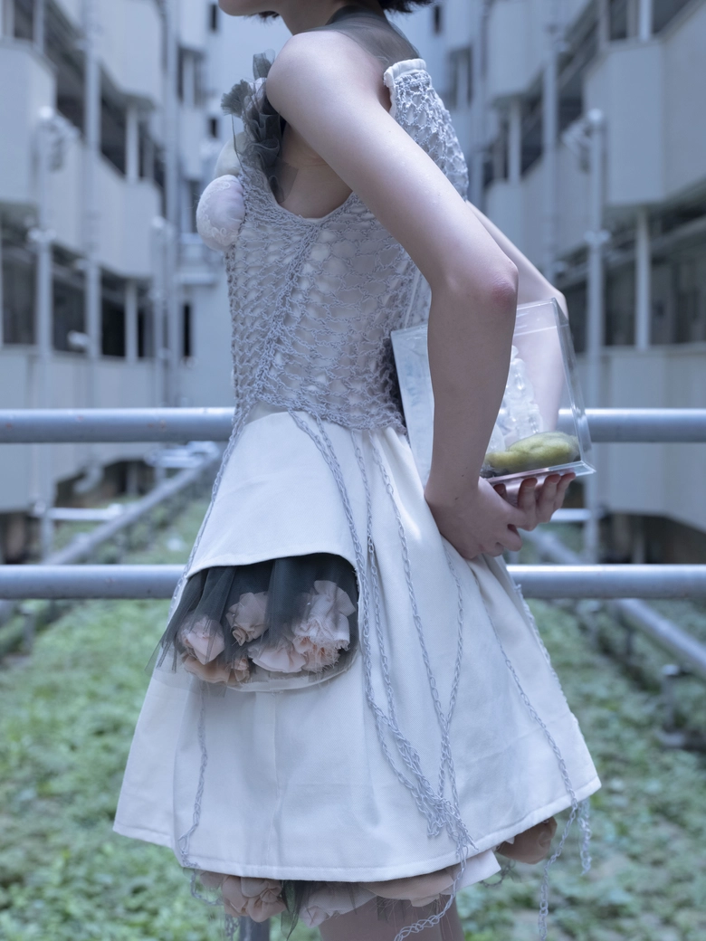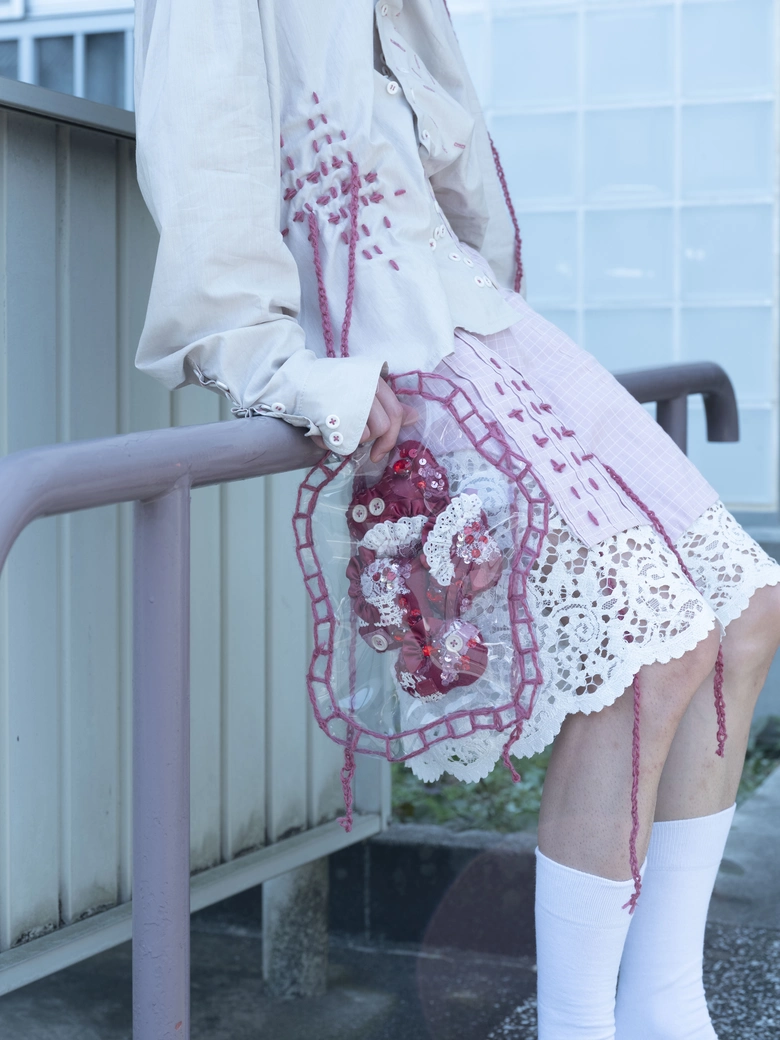 まず注目すべきは、すべてのルックにファッションアイテムが組み込まれている点だ。これまでは衣服単体のデザインが中心であったが、今年度はルックの一部として、バッグやぬいぐるみなどの携行可能なアイテムをデザインに取り入れている。全29体のルックすべてがこうしたアイテムを伴うのは、早稲田大学繊維研究会のショーとしては初めての試みである。