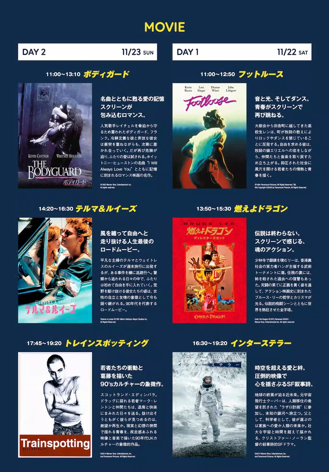 会場内に特設されるシアターでは、「青春」「自由」「愛」「旅」「強さ」「時間」といった普遍的なテーマを描く6本の映画を上映。BILLY’S ENTがキュレーションした作品を通じて、カルチャーの本質に触れる2日間となる。